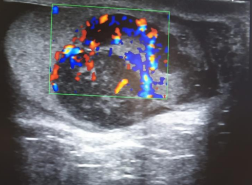 La ecografía (con doppler) informa de testículo derecho heterogéneo con múltiples áreas hipoecogénicas. Lesiones con marcada vascularización; compatibles con neoformación testicular derecha.