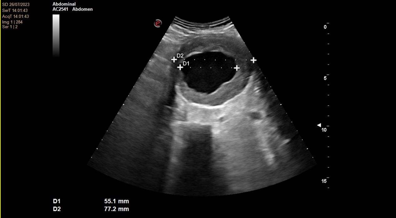 No se consigue visualizar el lóbulo hepático izquierdo ni páncreas por interposición de gas intestinal. Lóbulo hepático derecho de ecogenicidad y ecoestructura normal. Vesícula biliar de paredes finas y lisas sin contenido en su interior. Vía biliar no dilatada. Se visualiza una arteria aorta a nivel abdominal de un tamaño de 78 x 77 mm en su diámetro máximo.