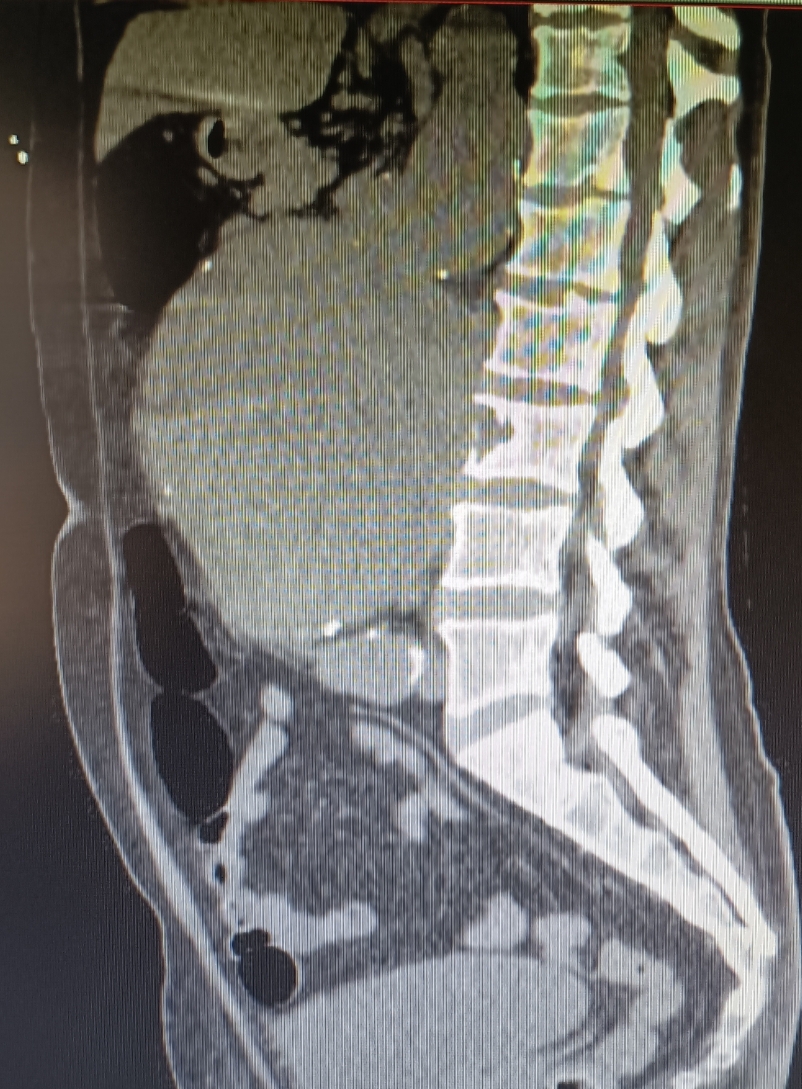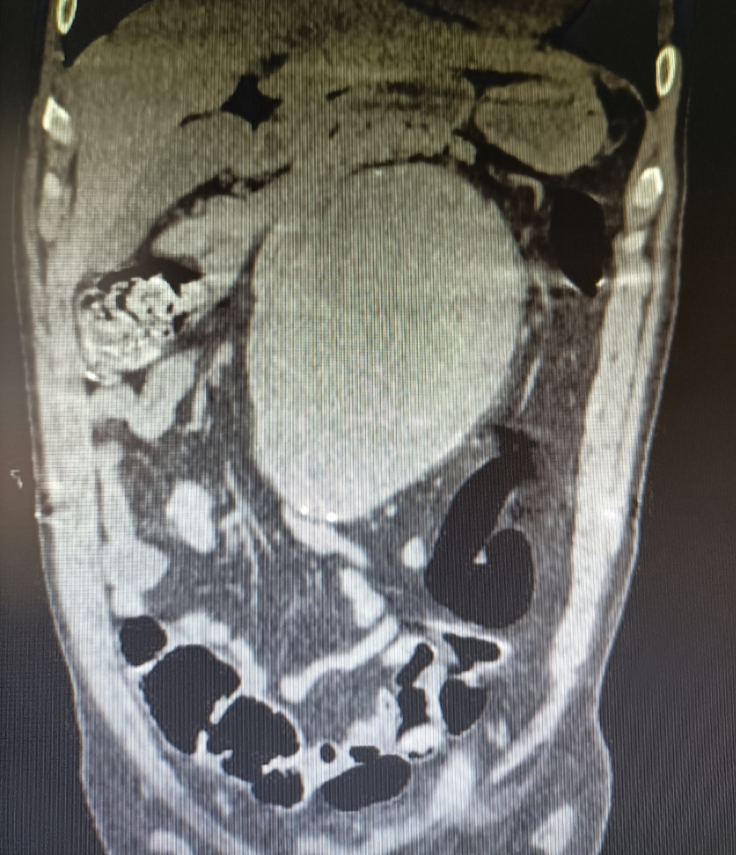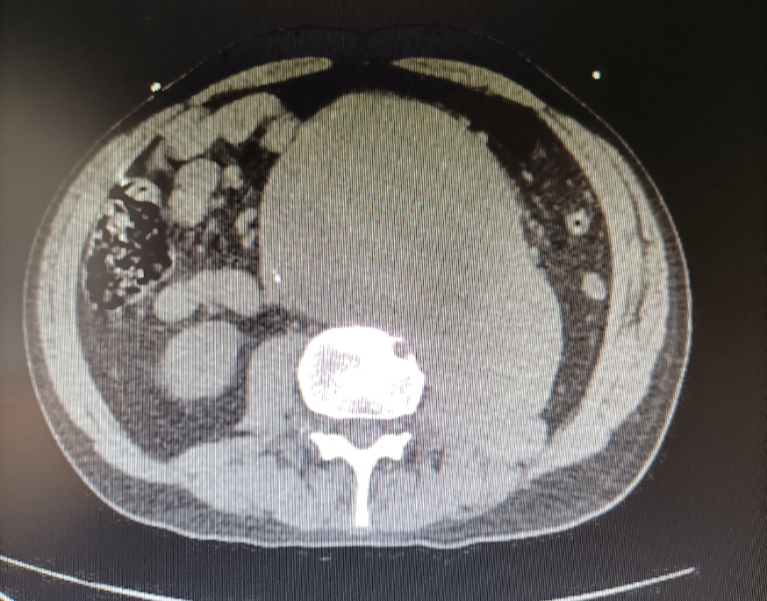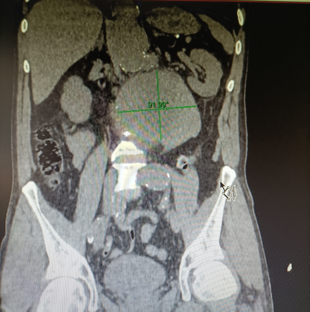 Se medica para control del dolor y se realiza Angio-TC de abdomen, donde se observan hallazgos compatibles con aneurisma de aorta abdominal infrarrenal de unos 14 x 13 cm que se extiende hasta bifurcación ilíacas, con calcificación intimal y trombo semilunar, con signos de rotura inminente.