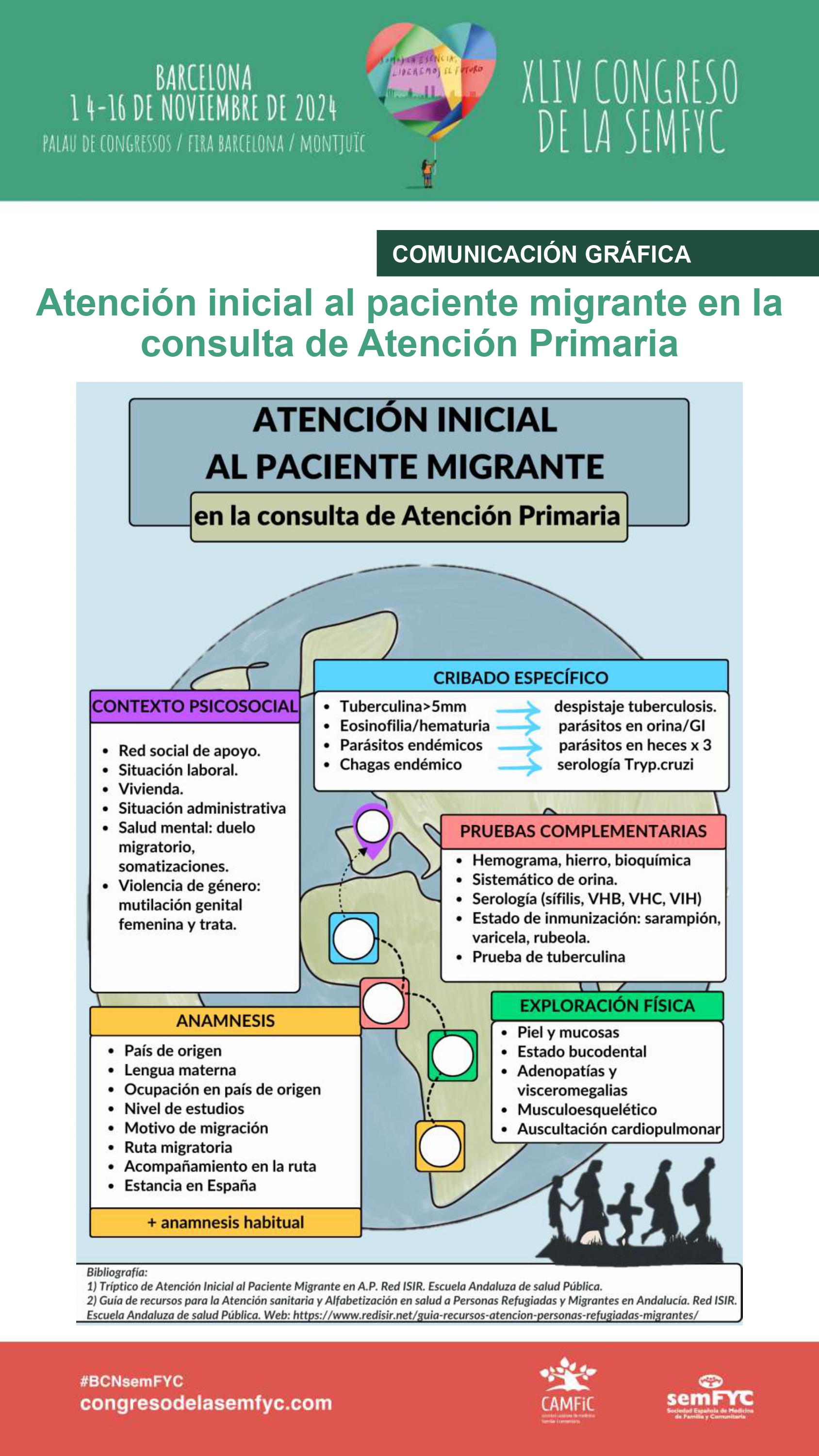 Se puede utilizar en las consultas como guía para enfocar una primera consulta con un paciente migrante. También permite consultar la bibliografía utilizada para la realización de la infografía para adquirir más información.