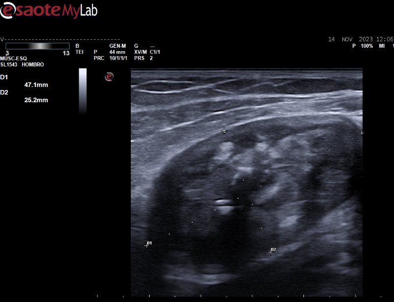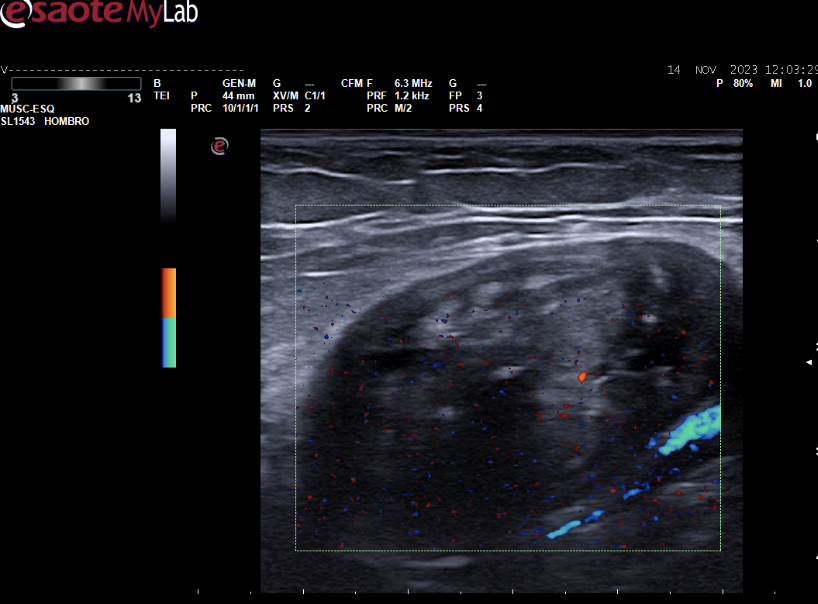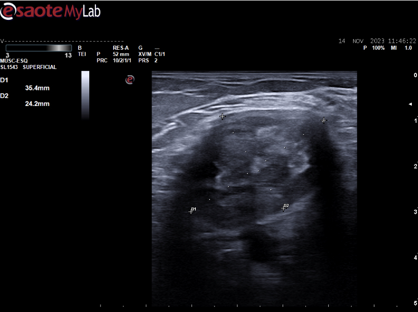 Masa heterogénea de 46*24 mm (zonas hipoecoicas con otras hiperecoicas y zona de microcalcificaciones) con escasa captación Doppler situada superficial al paquete vascular. No se observa lesión quística en la localización teórica del quiste de Baker.