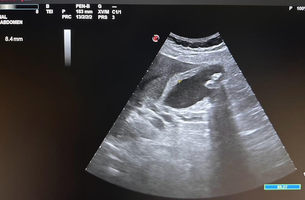 Ecografía abdominal en el Centro de Salud: imagen de dos lesiones hiperecóicas con sombra posterior localizadas en vesícula biliar de 12,8 mm x 6,31 mm y 9,22 mm x 6,57 mm que corresponde a litiasis vesicular. Engrosamiento de la pared de vesícula 8,4 mm y dilatación de la vía biliar.
