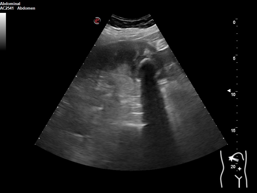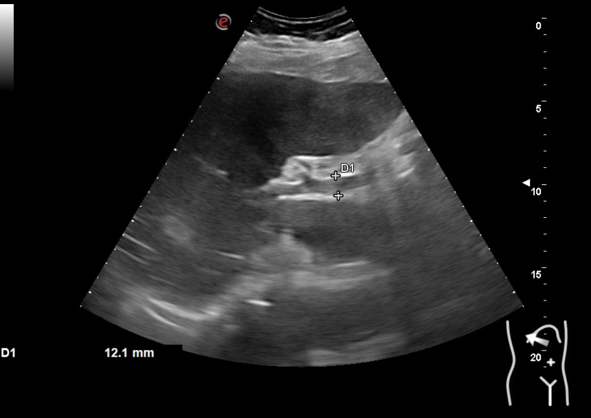 Varón de 75 años que acude por dolor abdominal de inicio en hipocondrio derecho y posteriormente en epigastrio con vómitos de 3 días de evolución. No fiebre. En la exploración física presenta subictericia y dolor a la palpación en epigastrio. Se decide realizar una ecografía en el centro.