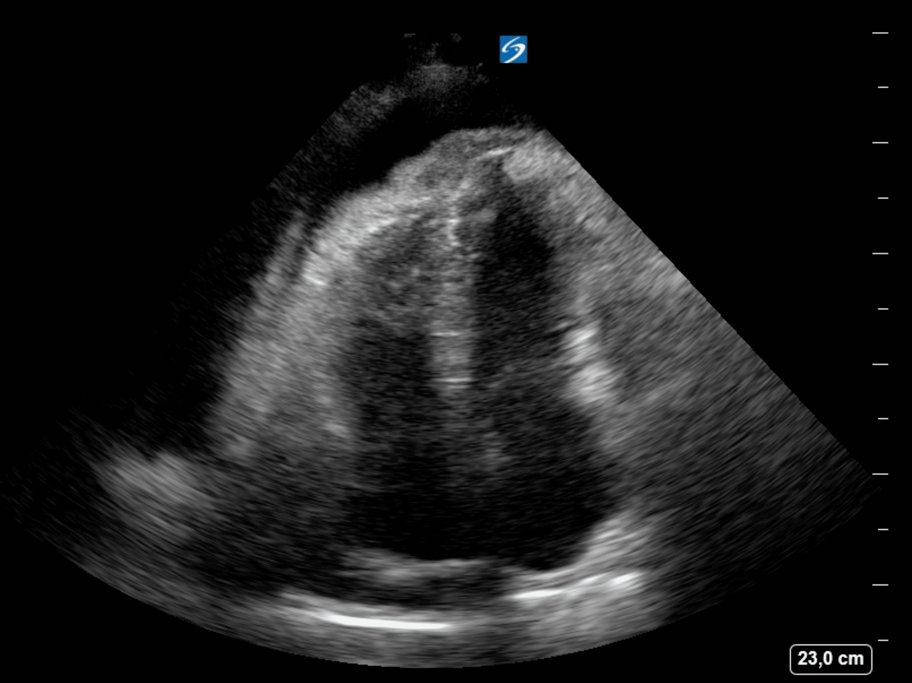 Se canaliza vía periférica para extracción de AS (x4), se administra SSF 500 ml iv. En urgencias se realiza un ecocardiograma EcoTT donde se visualiza un derrame pericárdico masivo, de hasta 6 cm a nivel inferior, circunferencial y con fibrina/implante a nivel del pericardio. Datos de colapso de cavidades derechas, swinning heart, variación de flujo transmitral 40% y TT 50%. VC dilatados, con colapso disminuido. Función biventricular normal.