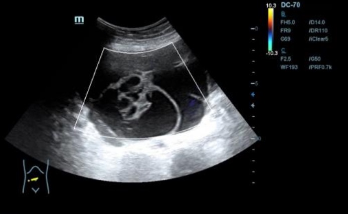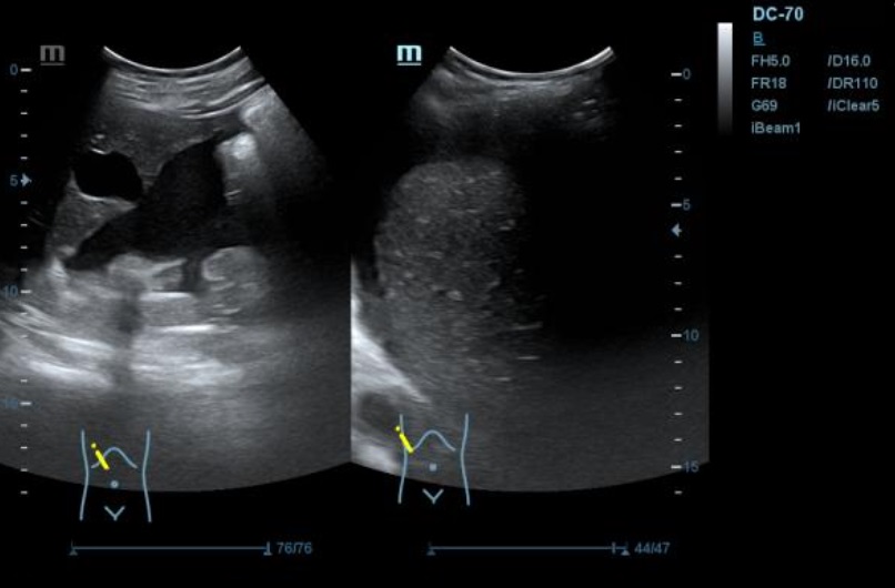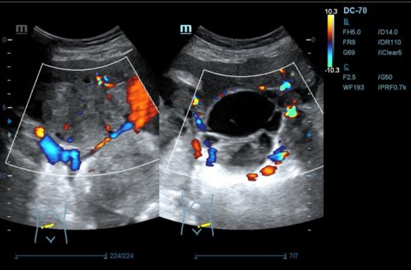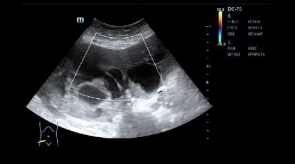 Ecografía: se observa presencia de líquido ascítico, e imagenes en hipomesogastrio hipo e hiper ecogénicas, tabicadas algunas, con efecto masa, con vascularizacion al Doppler que sugieren carcinoma de ovario.