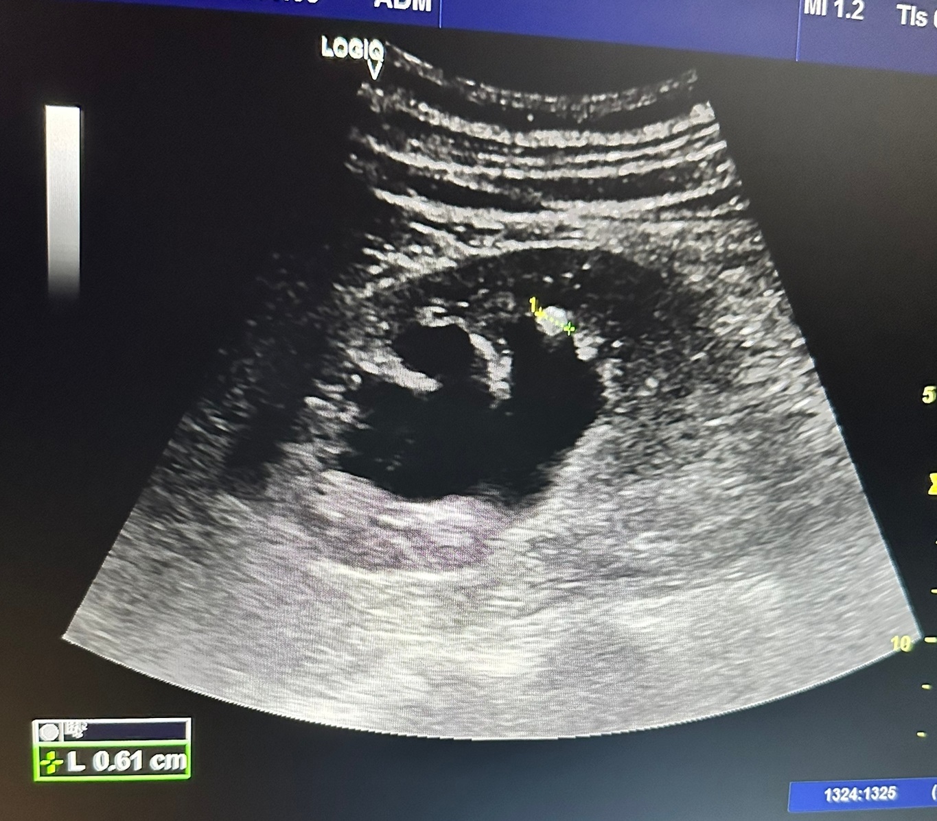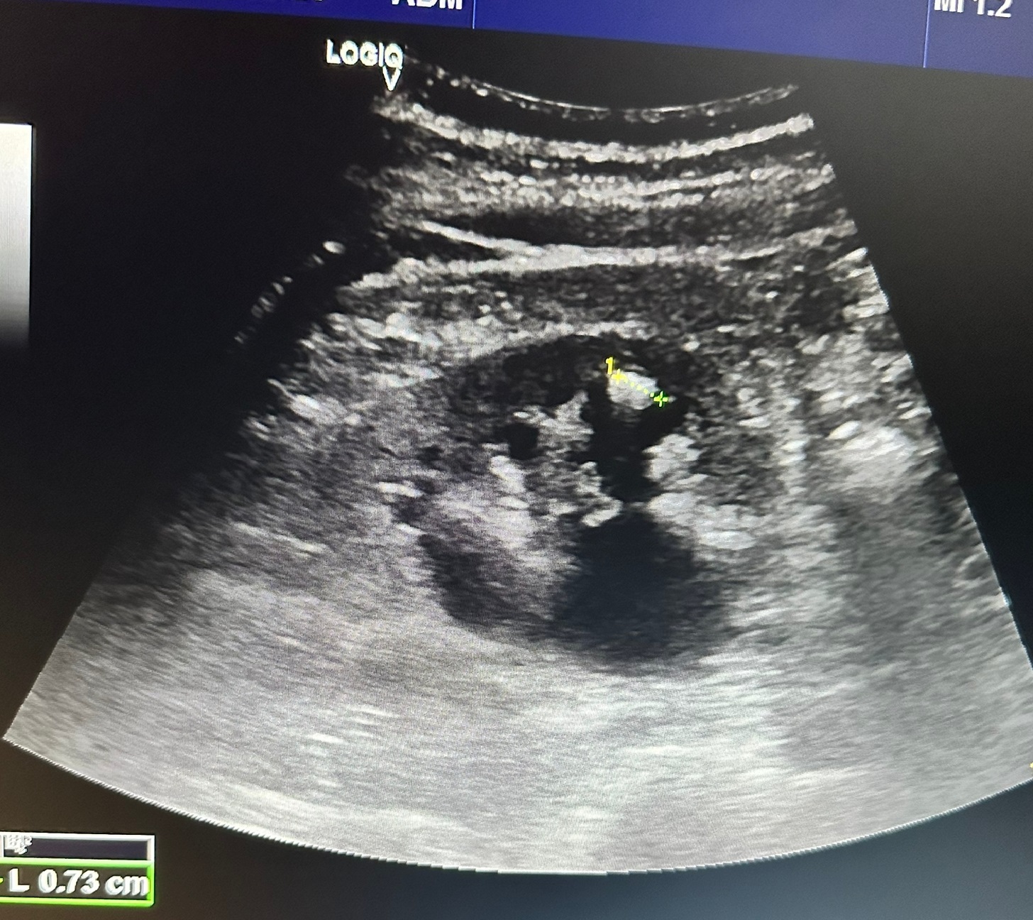 Refiere dolor lumbar derecho con irradiación hacia hipogasatrio de pocas horas de evolución, asociado a nauseas y algun vomito aislado de contenido alimenticio. En la exploracion fisica destaca ausencia de fiebre, normotenso y dolor en flanco derecho a la palpación profunda con puño percusion lumbar bilateral negativo. En el momento de la exploración se realiza ecografía a pie de cama que confirme nuestra sospecha diagnóstica, observandose hidronefrosis y litiasis renal.