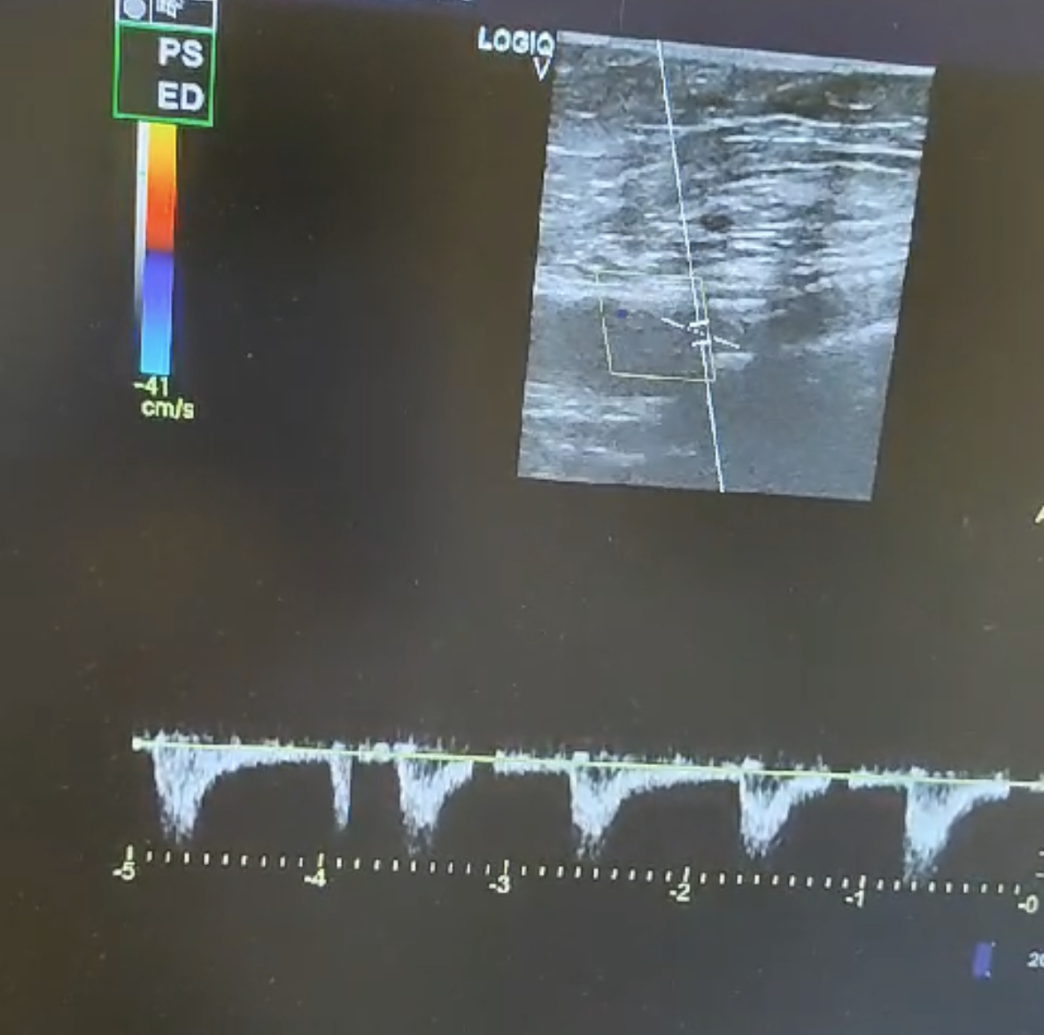 El paciente relata dolor gemelar y aumento de claudicación intermitente. Se realiza ecografía a pie de cama donde se observa trombosis del stent de toda la femoral superficial.