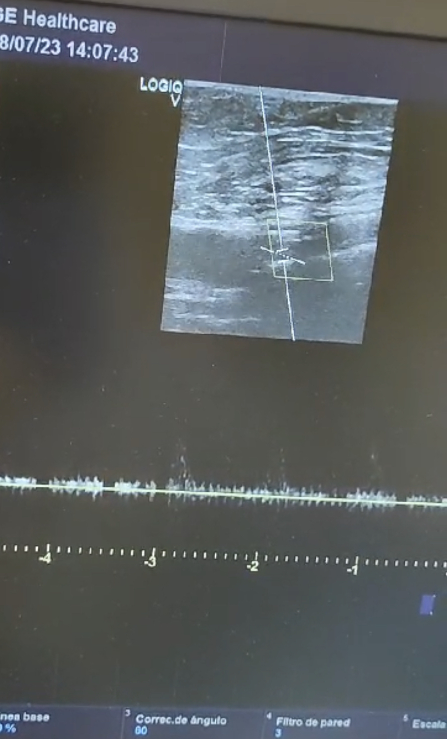 Durante la ecografía se observa sten de la femoral superficial ocluido, observándose flujo en la zona previa al stent y sin observarse flujo sanguíneo en el stent.