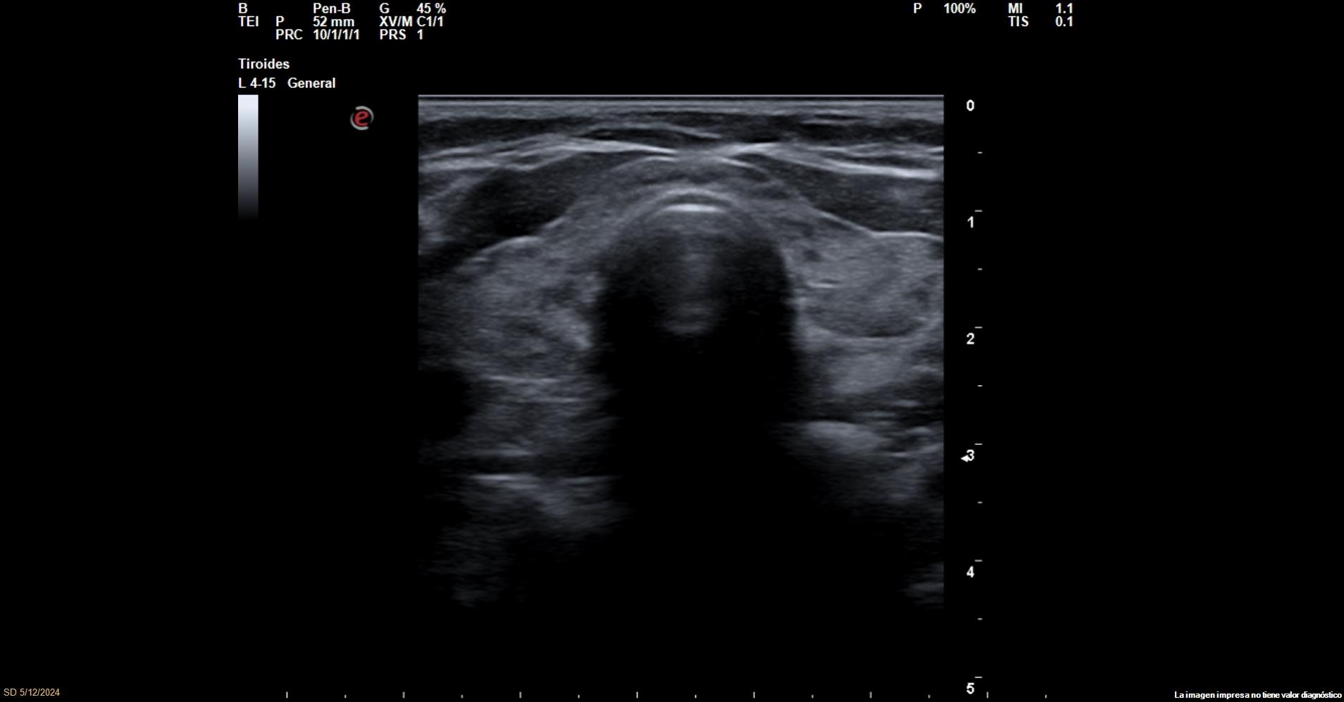 Istmo ecográfico conservado 3,4 mm de ancho. No se observan actualmente adenopatías regionales.