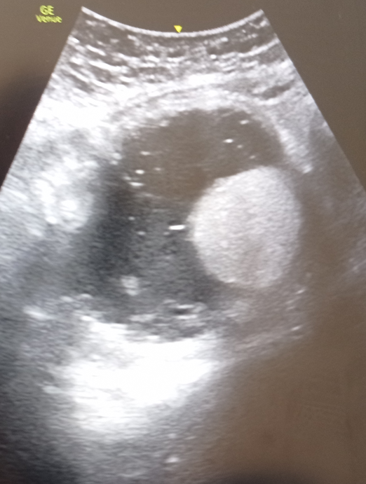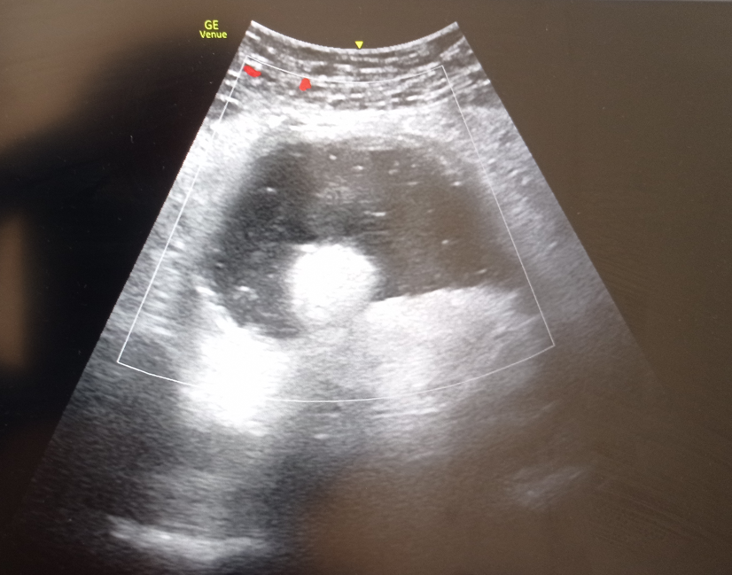 En urgencias, administramos analgesia de primer escalón. Tras 3 h de evolución, se decide realizar ecografía abdominal a pie de cama por persistencia del dolor viendo una imagen sugestiva de masa adyacente a ovario derecho que no conseguimos visualizar.
