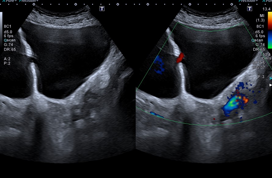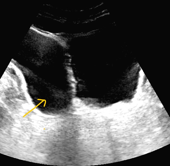 Paciente de 67 años que refiere síntomas de unos 3 años de evolución consistentes en polaquiuria, disminución del chorro miccional, nicturia, sensación de vaciado incompleto y ocasionalmente urgencia miccional. No presenta hematúria, disuria ni dolor abdominal.Hallazgos ecográficos