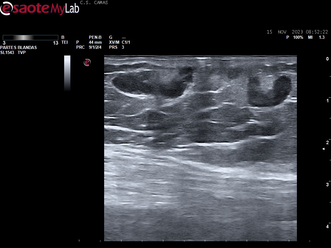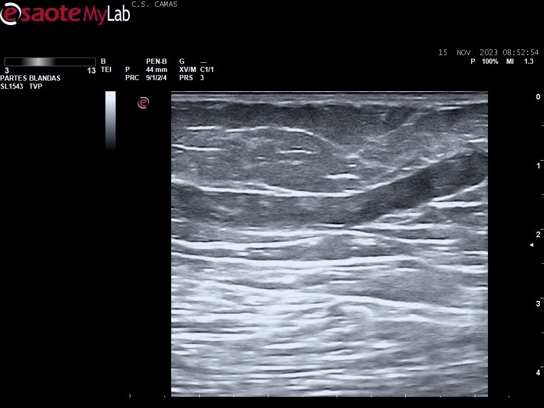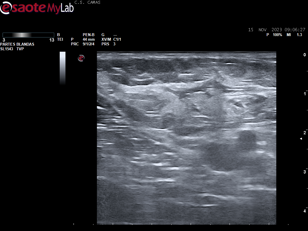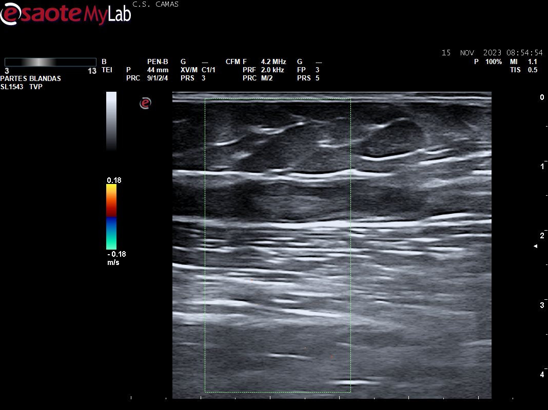 A la exploración se aprecia cordón varicoso en cara interna del muslo izq. Se realiza POCUS en consulta para descartar la presencia de TVP.