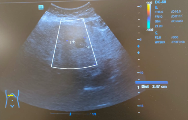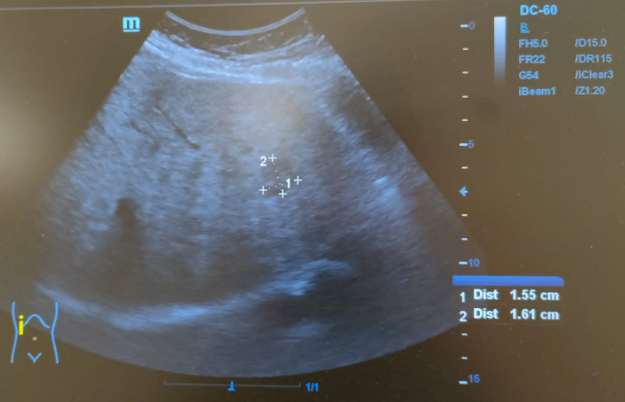 Tras realizar la ecografía en el CAP se observó un nódulo hipoecoico de contornos irregulares. Entre los diagnósticos diferenciales posibles que justificasen el patrón de colestasis se encontraba el CHC o una metástasis, por lo que se realizó una prueba complementaria que confirmó el diagnóstico de CHC.