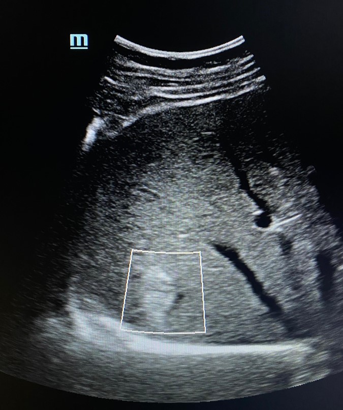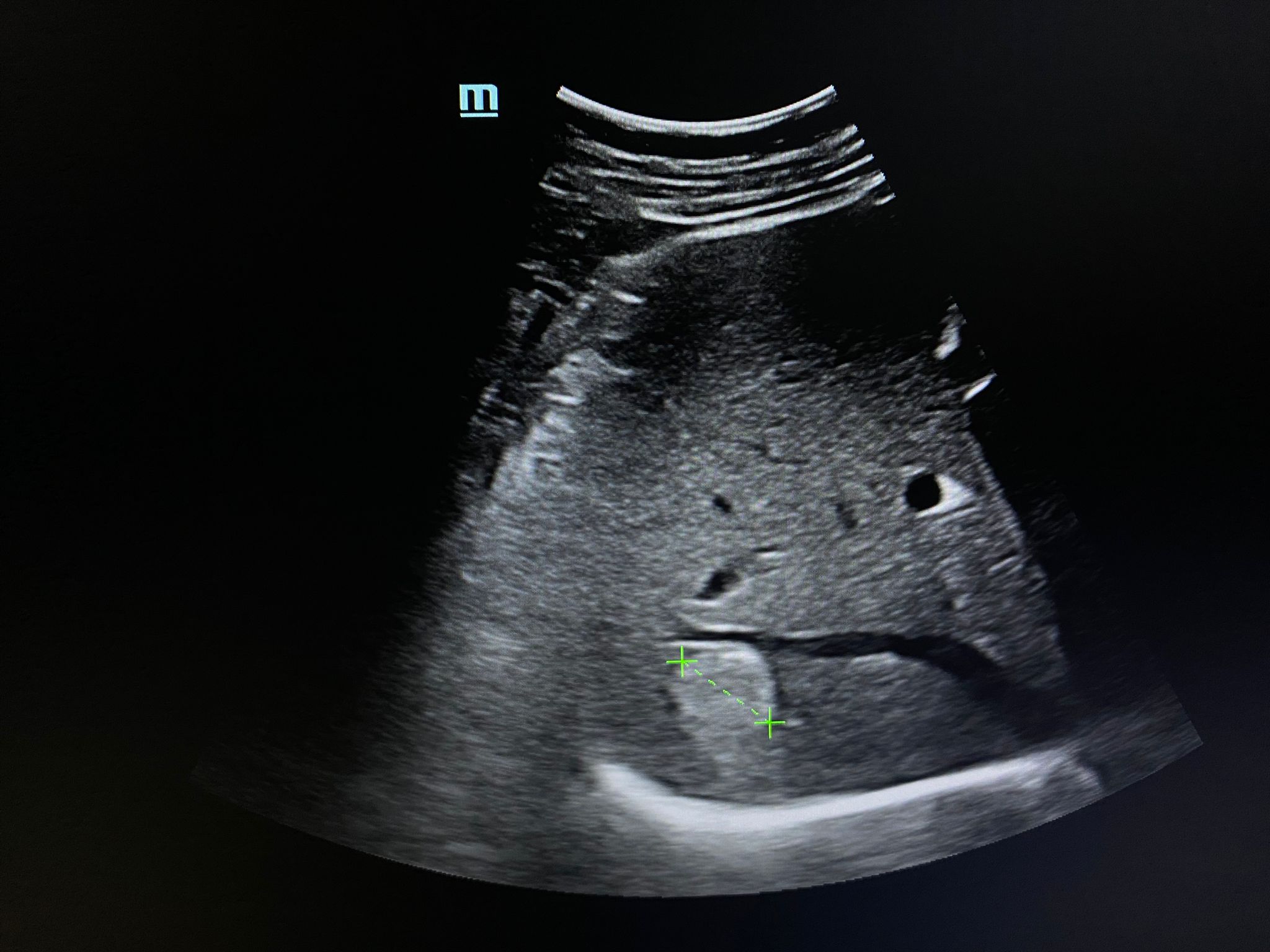 Como hallazgos, se aprecia un aumento moderado y difuso de la ecogenicidad hepática, ya descrito en ecografías previas, además de algunas áreas más hipoecoicas de límites geográficos en cara anterior de la bifurcación portal que pudieran corresponder a zonas de parénquima libre de grasa. Pero además, en el lóbulo hepático derecho, se aprecia una LOE solitaria hiperecogénica, de bordes irregulares, bien delimitada, con un halo hipoecoico y con registro Doppler negativo.