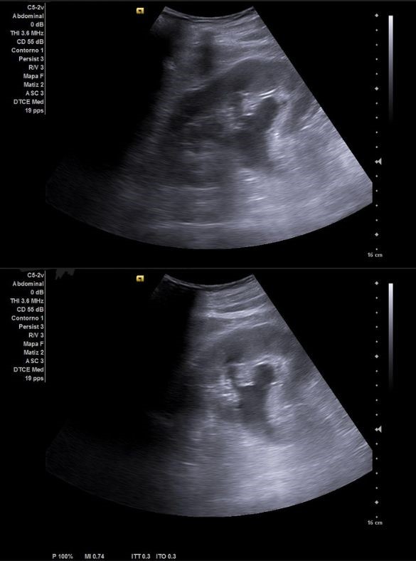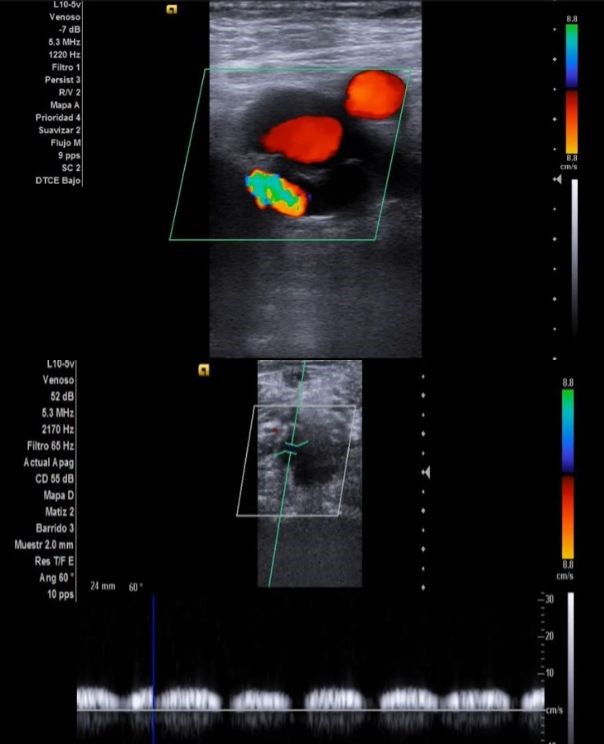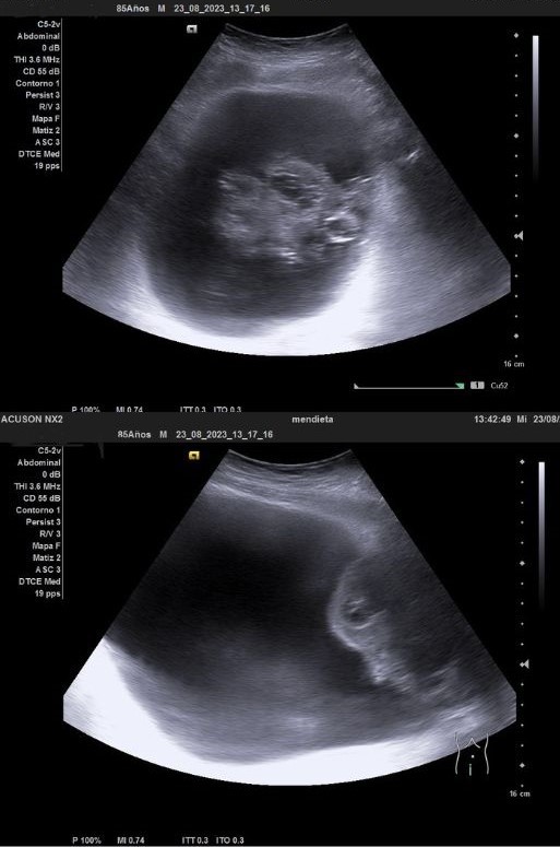 Exploración pulsos presentes y simétricos, extremidad izquierda edematizada respecto a derecha, con tumoración indurada en ingle izquierda. Abdomen distendido, no doloroso, se palpa masa a nivel de hipogastrio que impresiona de globo vesical. Realizamos ecografía clínica a descartar trombosis venosa.