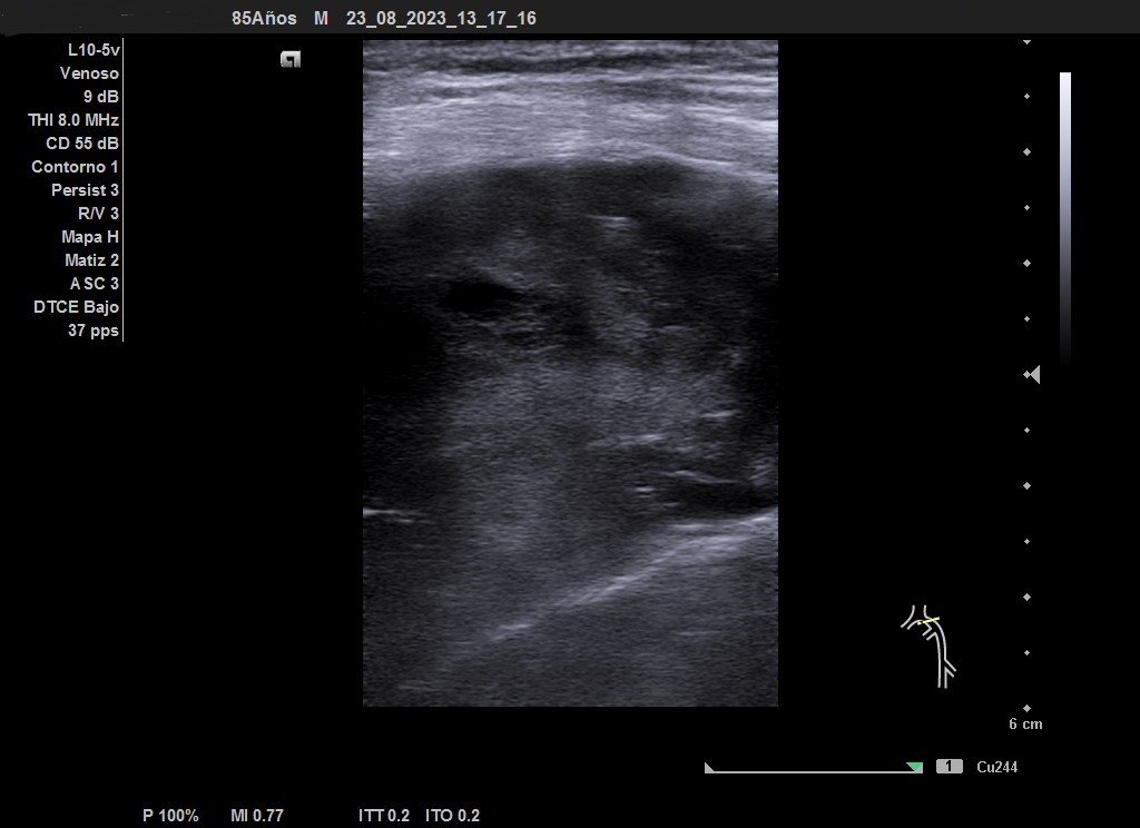 Ecografía venosa: venas femorales y poplíteas permeables. A nivel inguinal se observa imagen heterogénea, mal definida, sospechosa de malignidad.