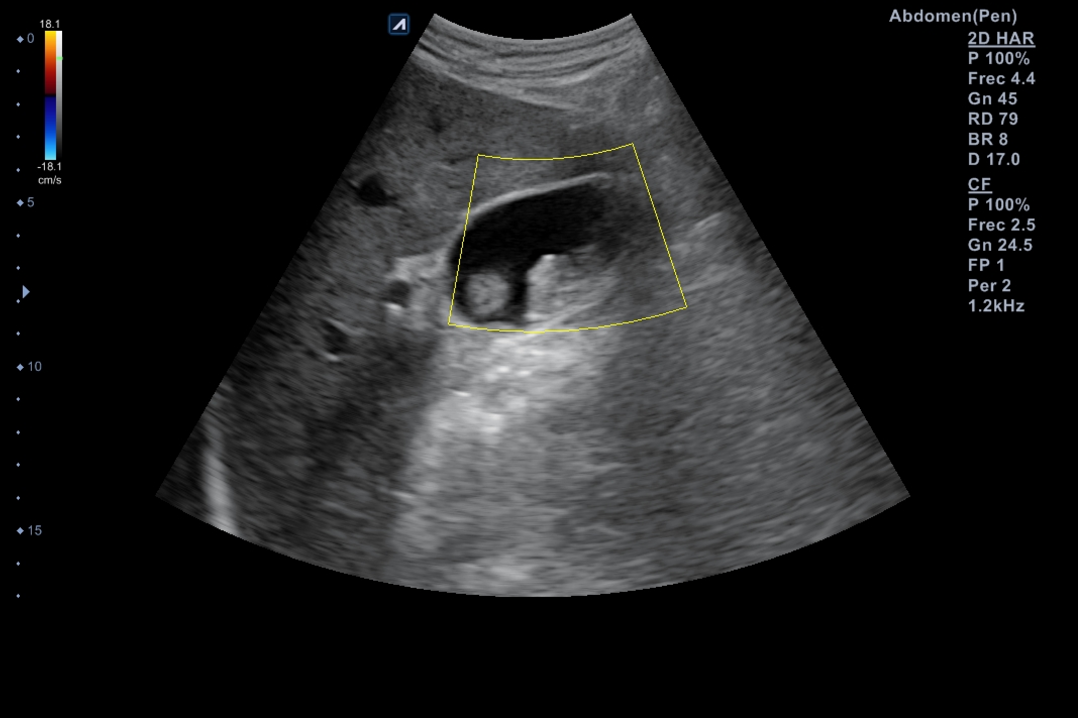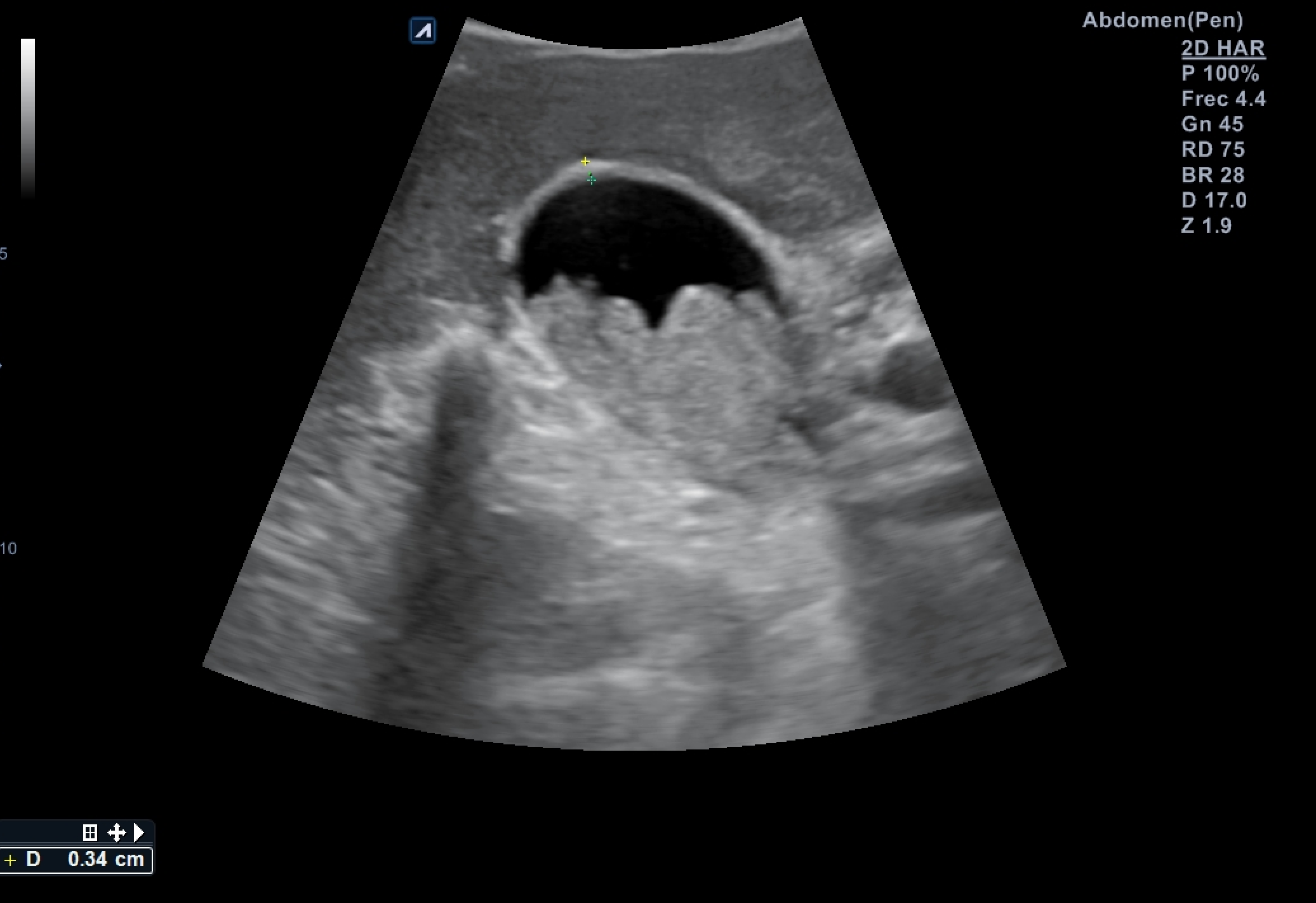 Ecografía abdominal dónde destaca vesícula biliar de pared fina (hasta 3,4 milímetros en su punto de mayor grosor) sin colecciones perivesiculares, que alberga en su interior imagen polilobulada sólida de efecto masa dependiente de su pared posterolateral e inferior que ocupa más de la mitad de la luz, sin captación de flujo Doppler, sugerente de polipoidea o tumoral, de unos 6 x 5 x 3 centímetros de dimensiones mayores.