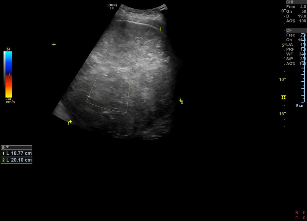 Ecografía de abdomen de Urgencias: se observa gran LOE pélvico abdominal ecogenicidad heterogénea, con hígado aumentado de tamaño y con imágenes hipoecoicas. Uterohidronefrosis derecha.