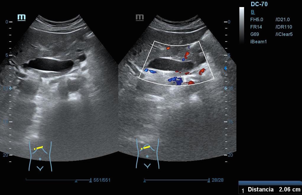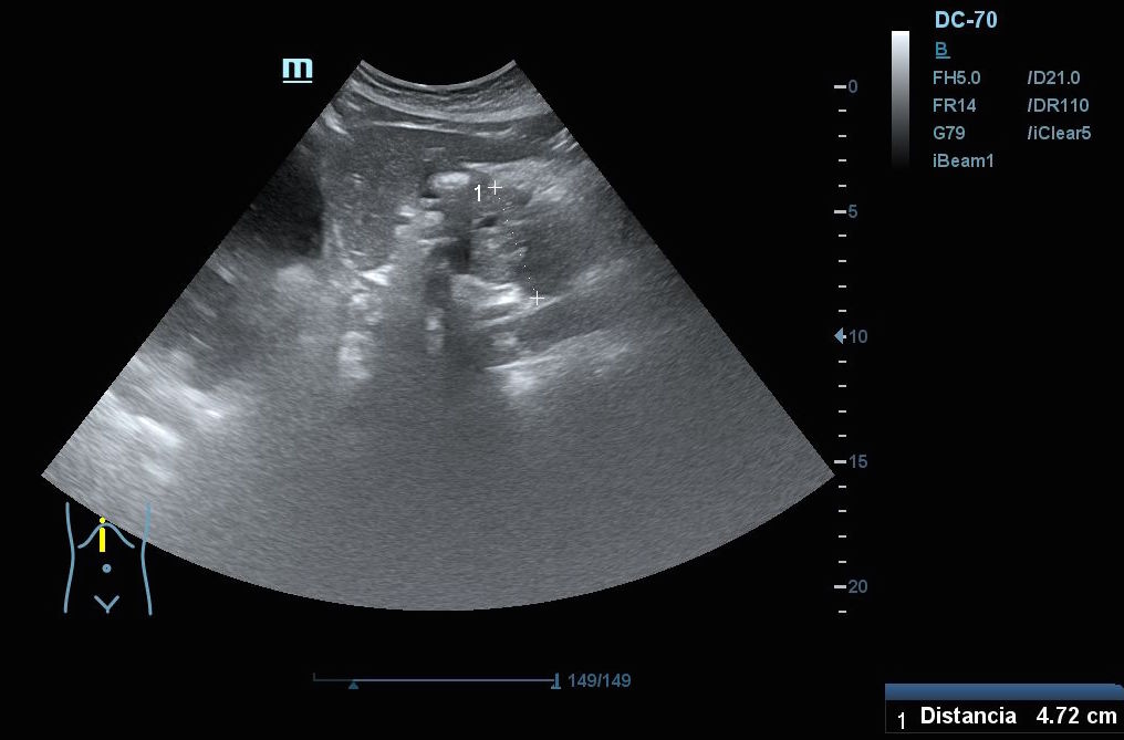 Hombre de 62 años con antecedente de viaje a México hace un mes, durante el cual ha presentado diarrea intermitente, acompañada de una pérdida de peso de alrededor de 10 kg. A la exploración física, como único hallazgo relevante, se observa un tinte subictérico, por lo que se decide realizar una ecografía clínica.