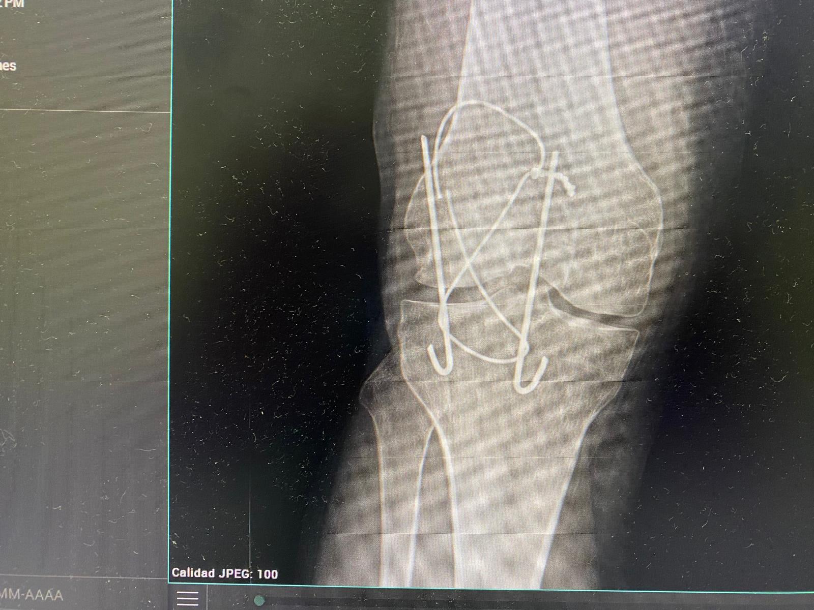 Paciente se cita en AP a los 30 días de la extracción de material de osteosíntesis, en la exploración física se objetiva herida quirúrgica limpia sin signos de infección, movilidad activa y pasiva de la rodilla recuperada totalmente con algún grado de dolor EVA 3/10 a últimos grados de movimientos en flexo-extensión, no signos de flogosis ni complicaciones postoperatorias inmediatas ni mediatas durante su estancia hospitalaria.
