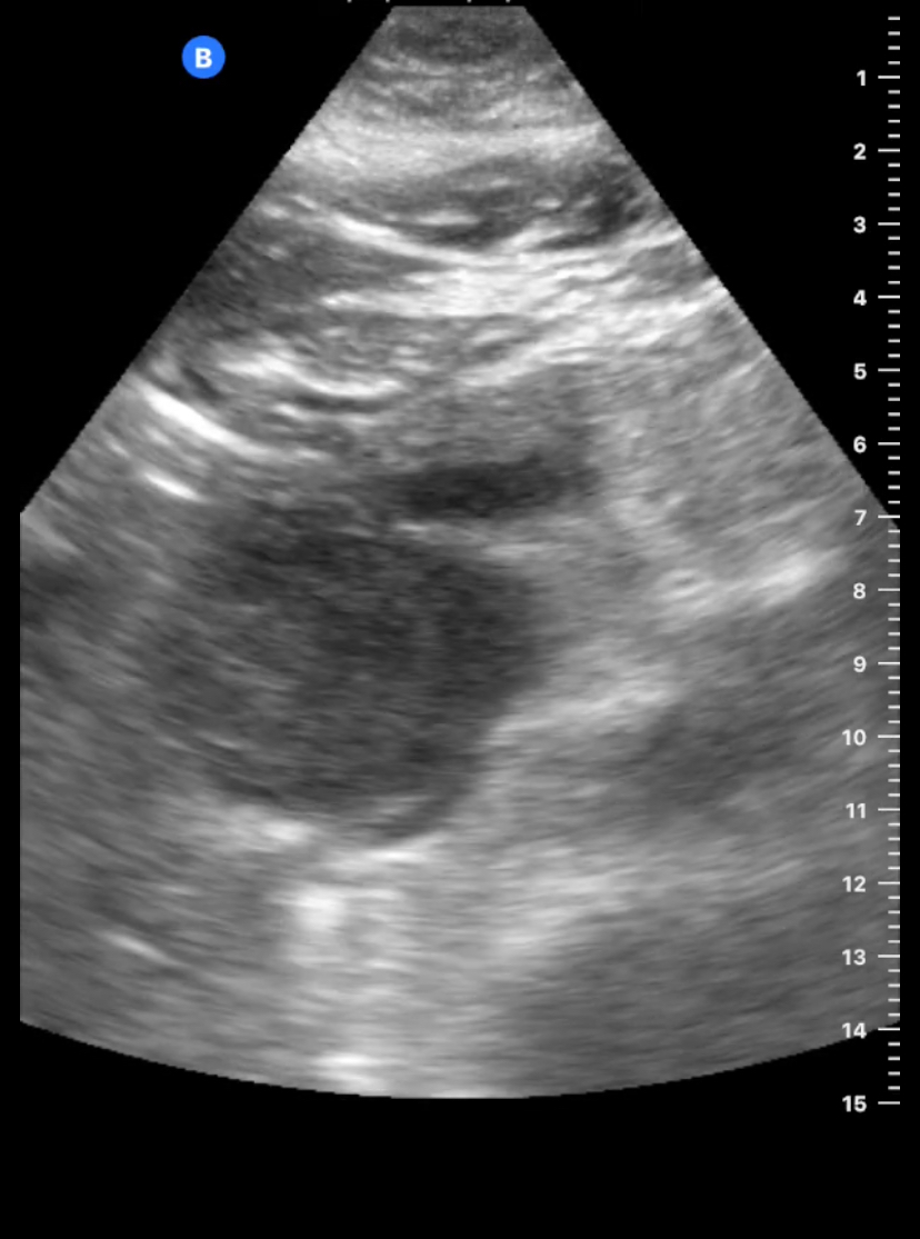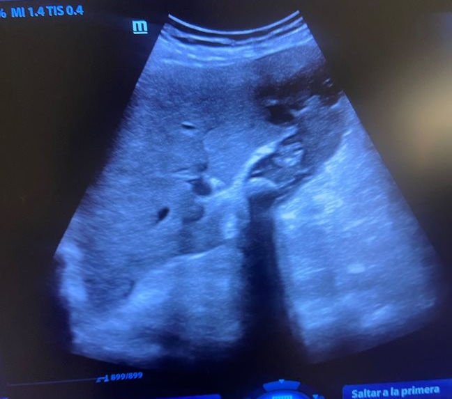 Paciente 2: vesícula distendida sin ecos en su interior, en línea media detectamos masa redondeada de 3-4 cm, Doppler positivo bajo proceso uncinado, dado dolor intenso no controlado se remite a urgencias e ingresa para estudio de posible masa pancreática.