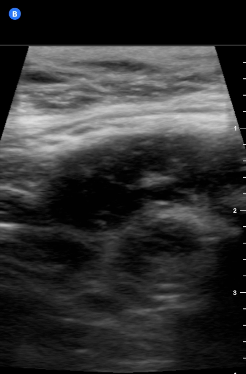 Paciente 3: con sonda lineal vemos asa intetinal engrosada (imagen de donut) y heterogenicidad alrededor del asa sugerente de abscesificación, se remite urgencias y se diagnostica de apendicitis abscesificada.