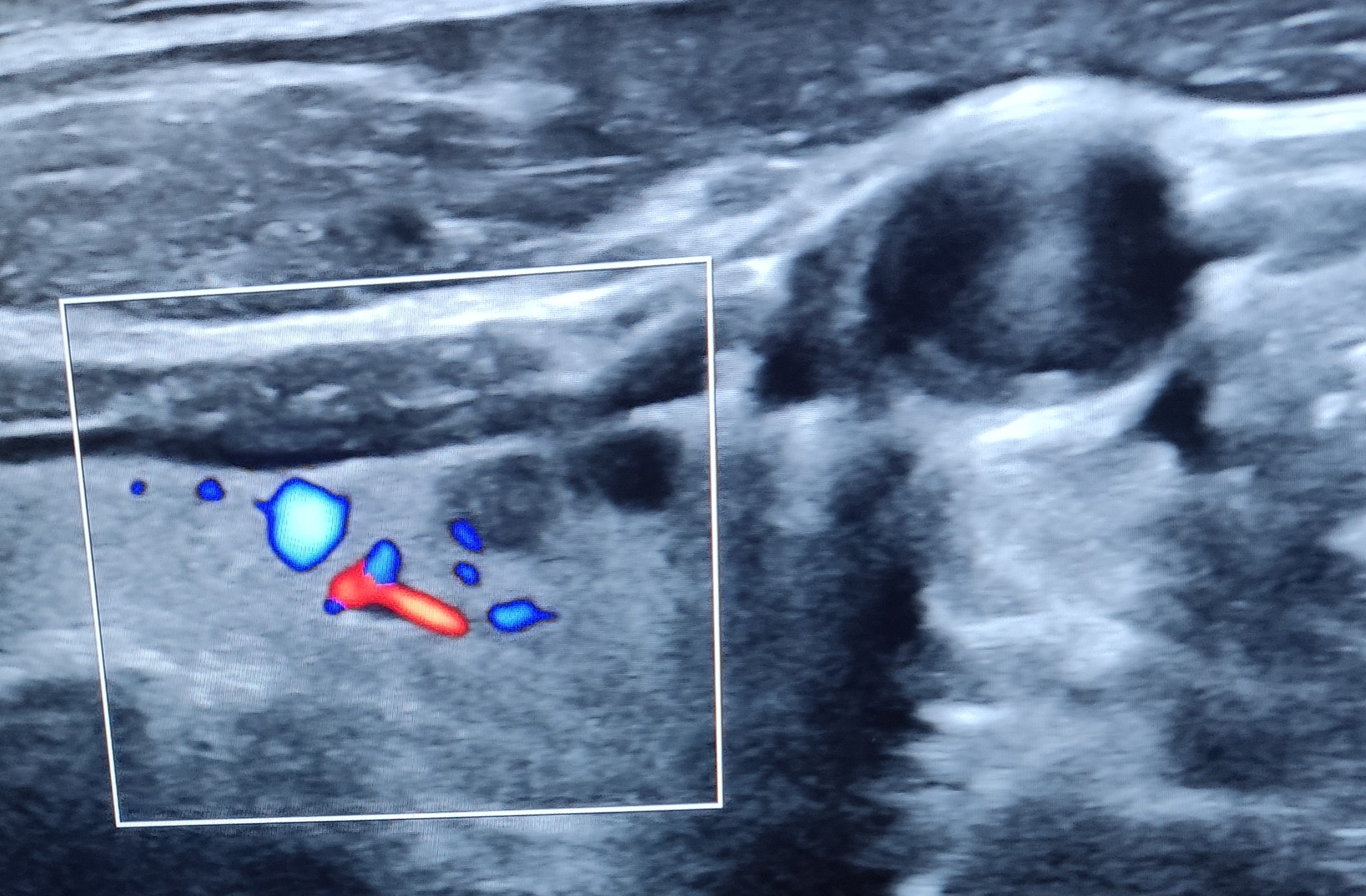 En la ecografía realizada en consulta se realizan diferentes mediciones, descartando hipertrofia glandular o bocio. Explorando ambos lóbulos posteriormente, se objetivan dos imágenes quísticas, subcentimétricas, anecoicas, con bordes bien definidos y refuerzo posterior, todo ello compatible con quiste benigno, de contenido posiblemente líquido o coloide, sin captación de Doppler.