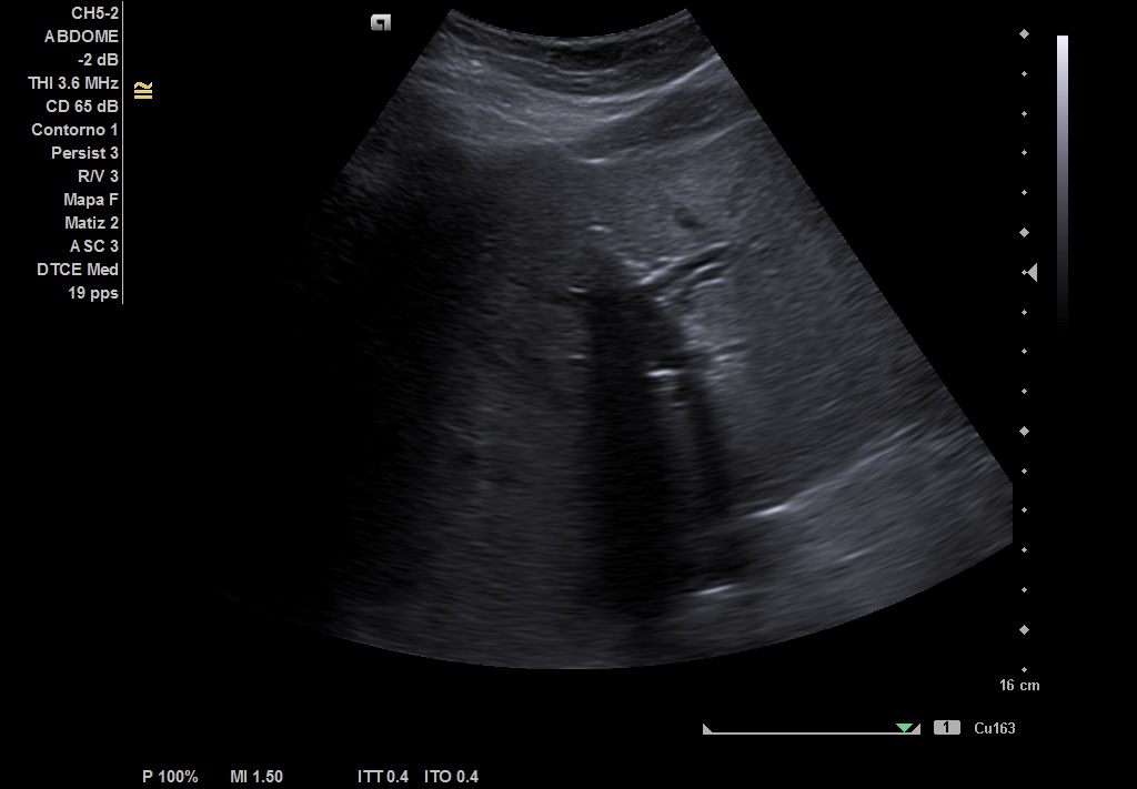 Realizamos ecografía abdominal en el Centro de Salud en el momento de la consulta y visualizamos: Colelitiasis y dilatación de la vía intra y extrashepática sin observar claramente causa obstructiva.