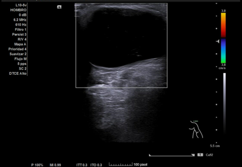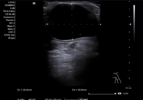 Ecografía hombro izquierdo: se observa una masa de 2,3 x 3,4 cm, anecoica en su totalidad, no tabicada, de bordes bien definidos y sin captación en Doppler.