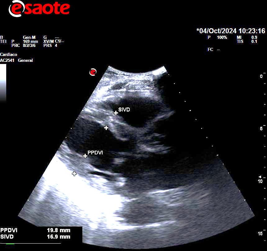 En la ecocardioscopia, se aprecia leve dilatación de aurícula izquierda, septo interventricular de 18 mm sin obstrucción del tracto de salida, FEVI estimada mayor del 55% sin segmentarismos ni discinesias, raíz aórtica normal, válvula aórtica trivalva, buena apertura de válvula mitral, no derrame pericárdico.