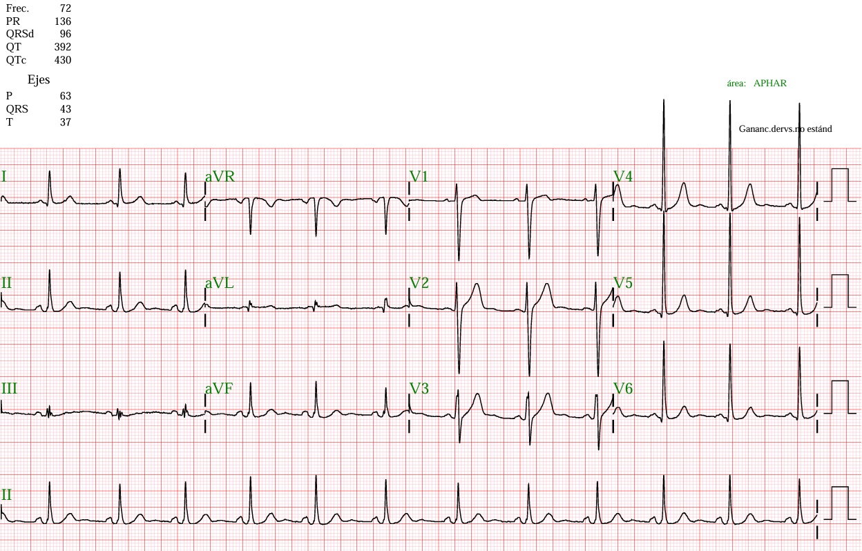 Salvo hipercolesterolemia de 248 mg/dl (LDL 173 mg/dl), el resto de la analítica es normal. Valores de TA en domicilio entre 122/81 – 146/95 mmHg. Se realiza ECG en la que se observa ritmo sinusal a 72 lpm, cumpliendo criterios de Sokolow-Lyon para hipertrofia ventricular izquierda. Radiografía de tórax normal.