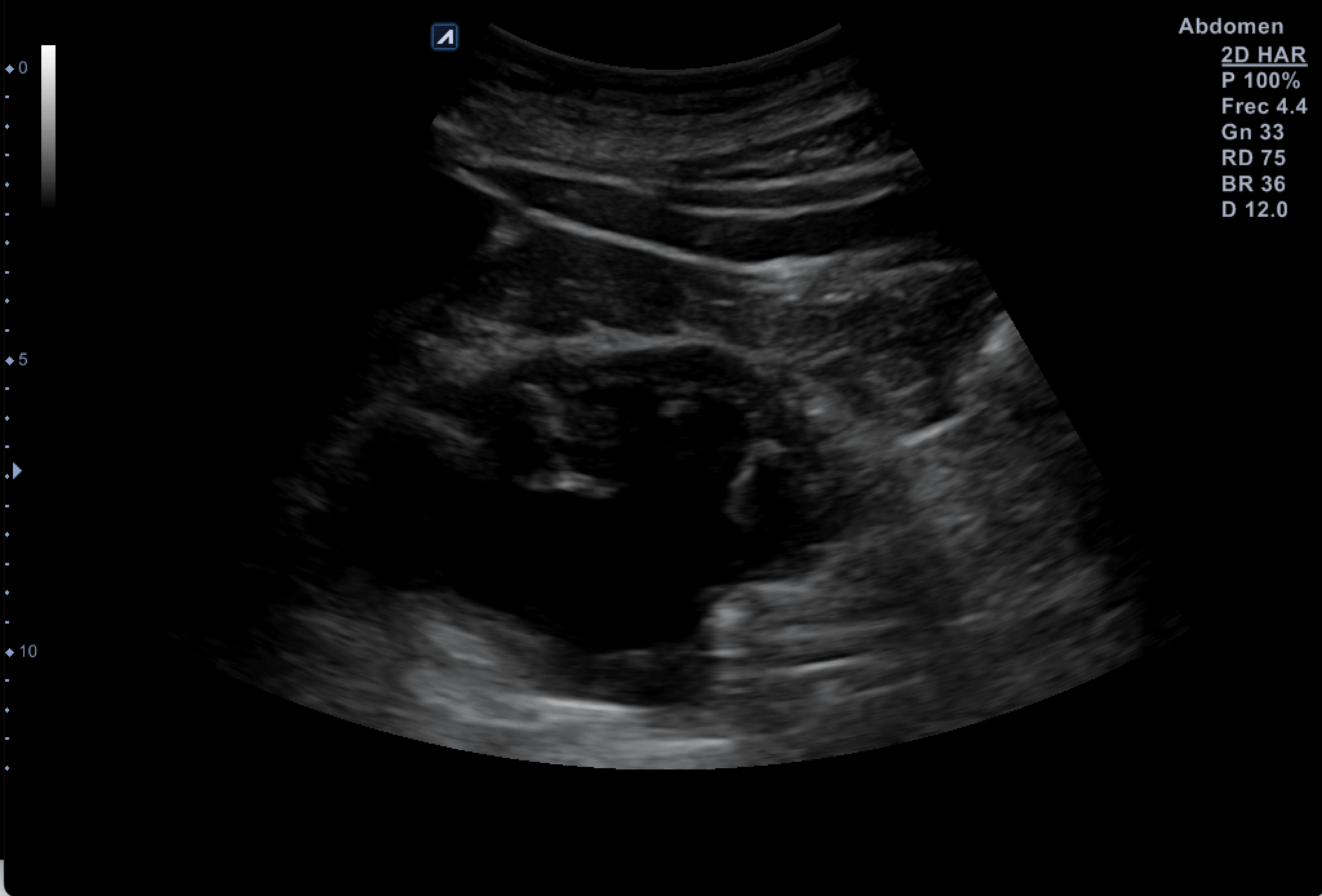 Tras valoración vesicoprostática con vejiga normal, jet vesicales visibles con próstata de 45 cc y residuo postmiccional mínimo. Riñón derecho como normal de tamaño y morfología sin dilataciones pielocaliciales (11 cm de tamaño). El Riñón Izquierdo (RI: 9 cm) presentaba una hidronefrosis grado IV y atrofia cortical con pelvis renal distendida, no consiguiendo detectar la causa obstructiva y considerando la posibilidad de una estenosis de la unión pieloureteral y como segunda opción una litiasis ureteral pese a la normalidad de los jets vesicales.