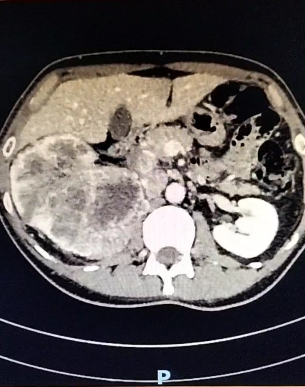 En la analítica sanguínea se destaca deterioro de la función renal y la analítica de orina señala la presencia de hematuria. Se comenta el paciente con el Servicio de Radiología y se consensúa realización de TAC tóraco-abdominal, donde se objetiva una neoplasia renal derecha que infiltra arteria y venas principales, con trombosis de la cava desde el hilio renal hasta la porción intrahepática así como adenopatías retroperitoneales.