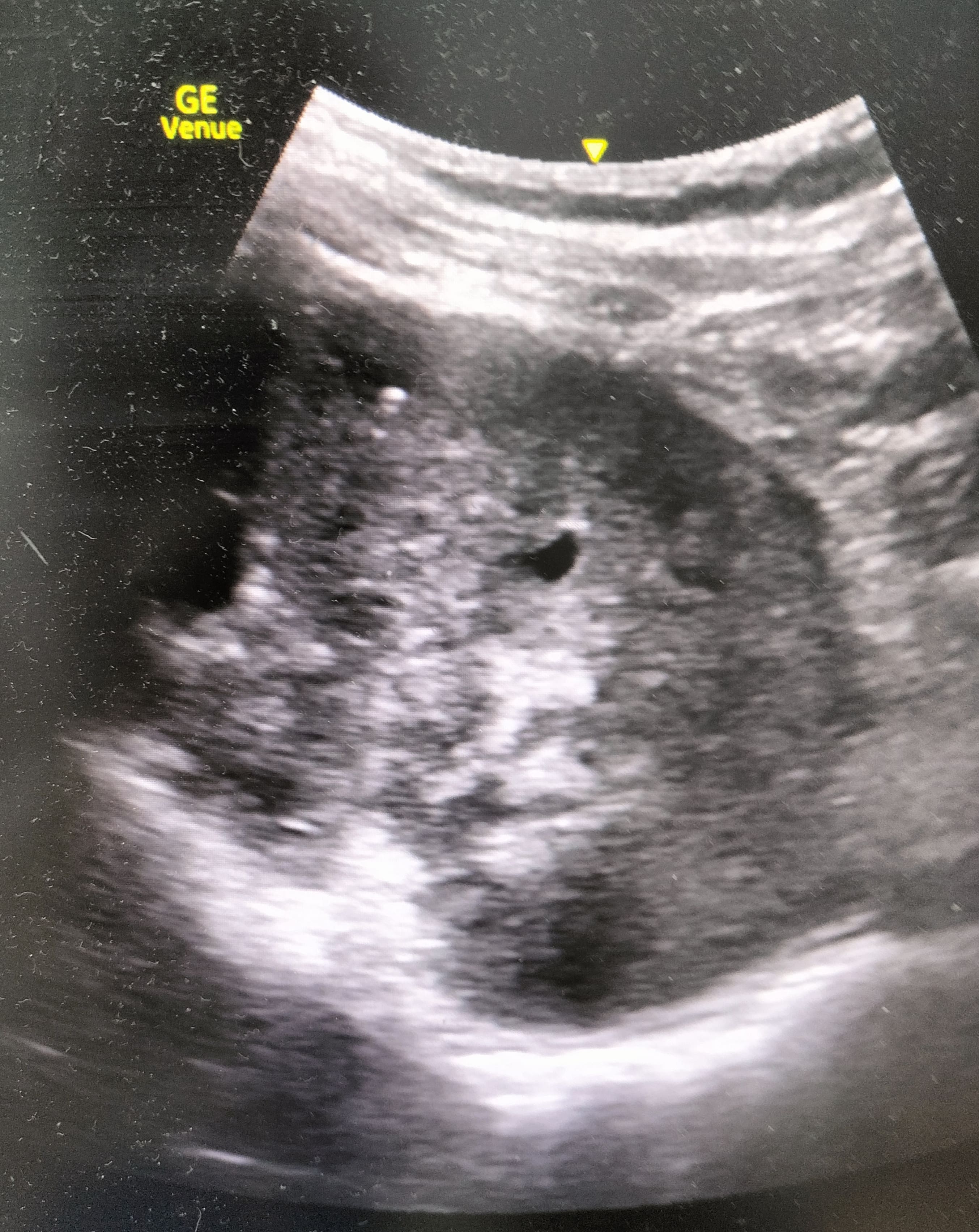 La realización de la técnica muestra riñón derecho aumentado de tamaño y una imagen compatible con una masa renal derecha con pérdida de la diferenciación cortico-medular. En contraposición se observa una silueta renal contralateral sin alteraciones.Pruebas complementarias