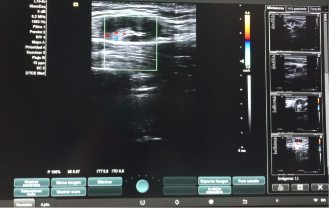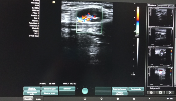 Dos adenopatías en territorio laterocervical derecho, con hilio central y doppler positivo, alguna con diámetro transversal superior al longitudinal, de probable origen reactivo y una adenopatía supraclavicular sin hilio central y con vascularización generalizada.