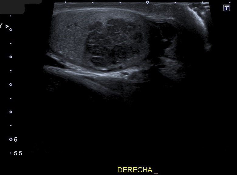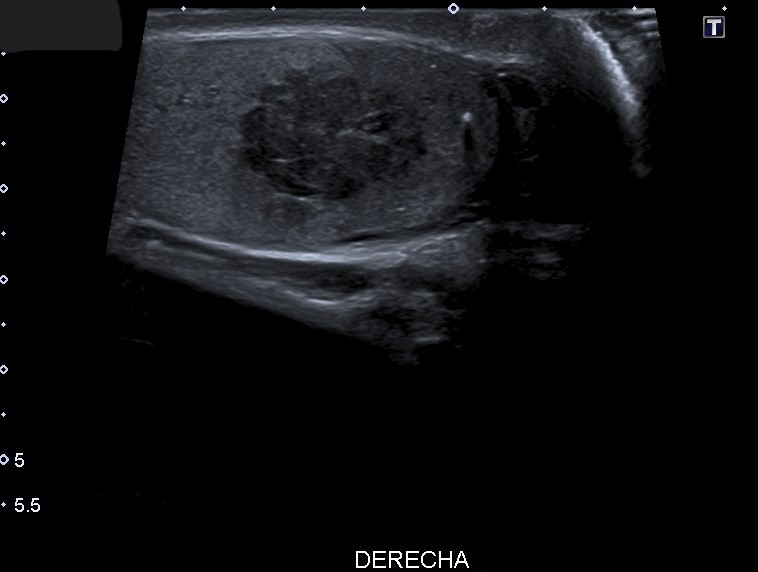 Ecografía escrotal: En testículo derecho se aprecia lesión heterogénea de predominio hipoecogénico con alguna calcificación grosera, polilobulada, de bordes mal definidos, con medidas aproximadas de 36 mm de diámetro máximo, con vascularización en su interior en el registro Doppler, sugestivo de proceso neoformativo testicular. No se objetiva engrosamiento epididimario ni de cubiertas escrotales.