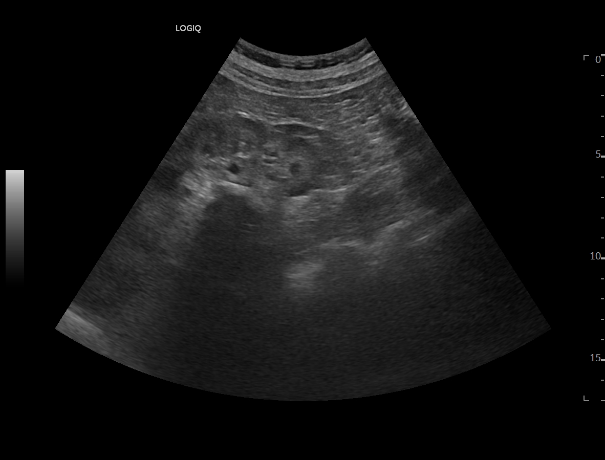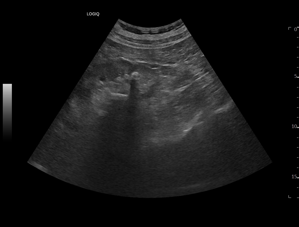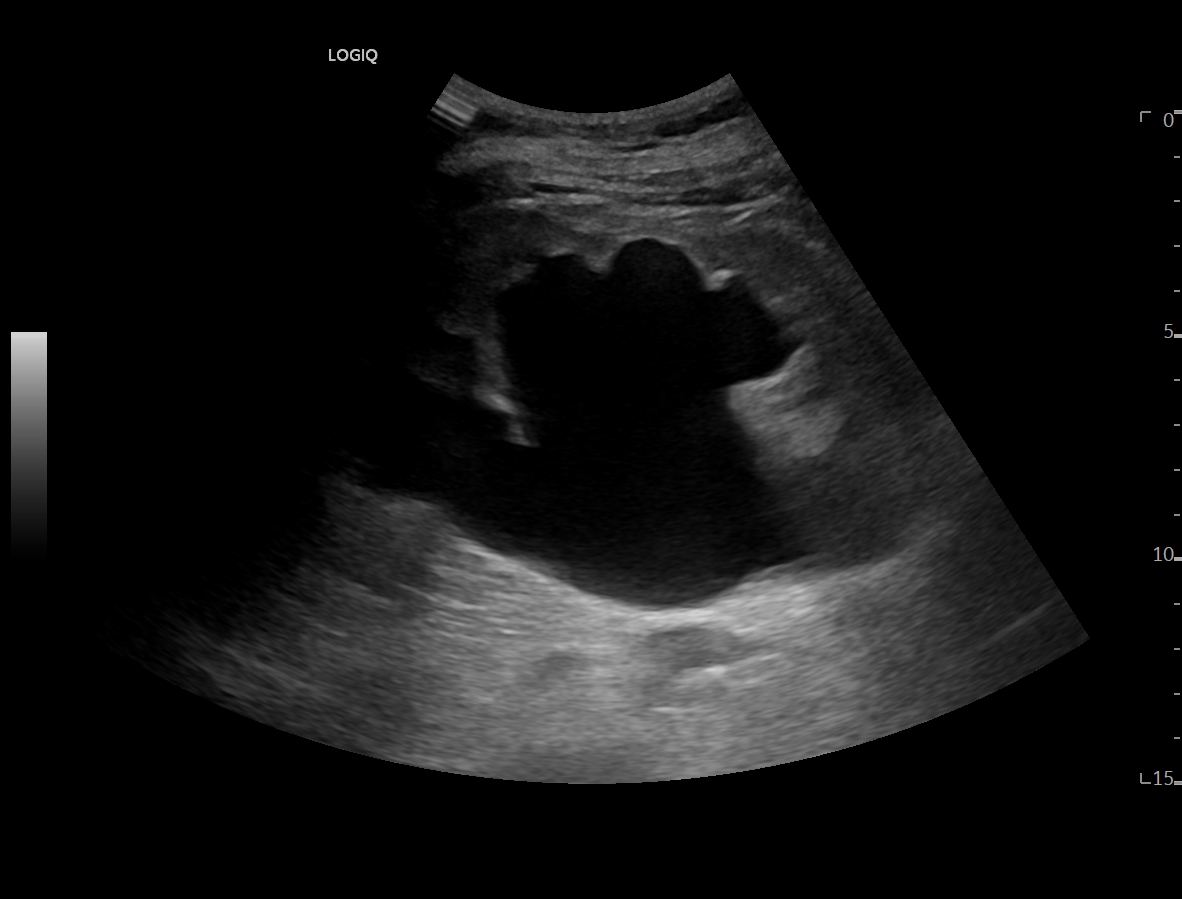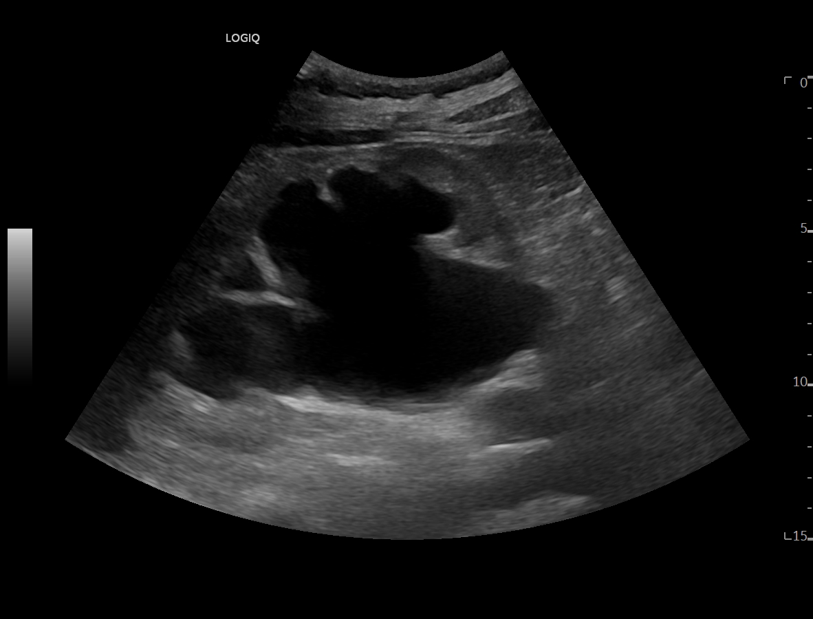 Ya en urgencias hospitalarias, se realiza ecografía clínica donde se aprecia ureterohidronefrosis derecha grado IV con pérdida completa de ecoestructura renal por el incremento del volumen que presenta, no presentando las mismas alteraciones en el lado izquierdo, pudiendo esto indicar una obstrucción completa no resuelta.