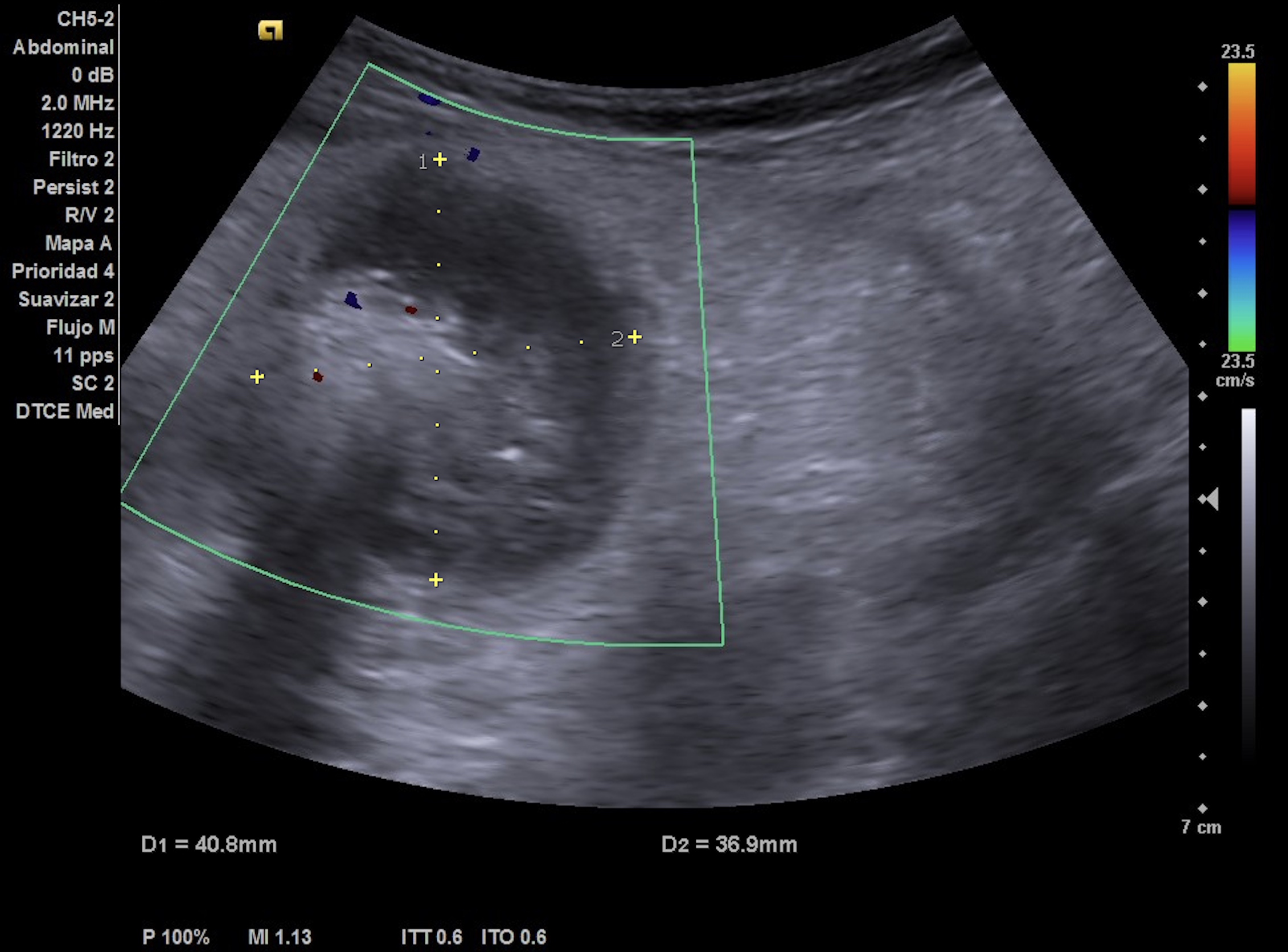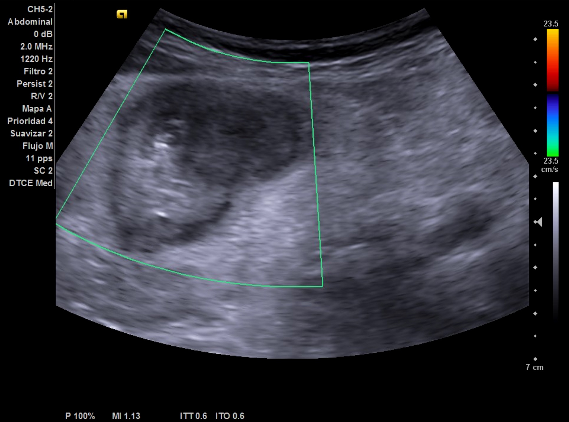 - Hígado de tamaño y eco-estructura normal. Riñón derecho normal. Imagen localizada anterior a riñón derecho, redondeada-ovalada, hipoecoica con zonas hiperecoicas en su interior, vascularizada probablemente compatible con signo de pseudo-riñón con sospecha de neoplasia de colon.