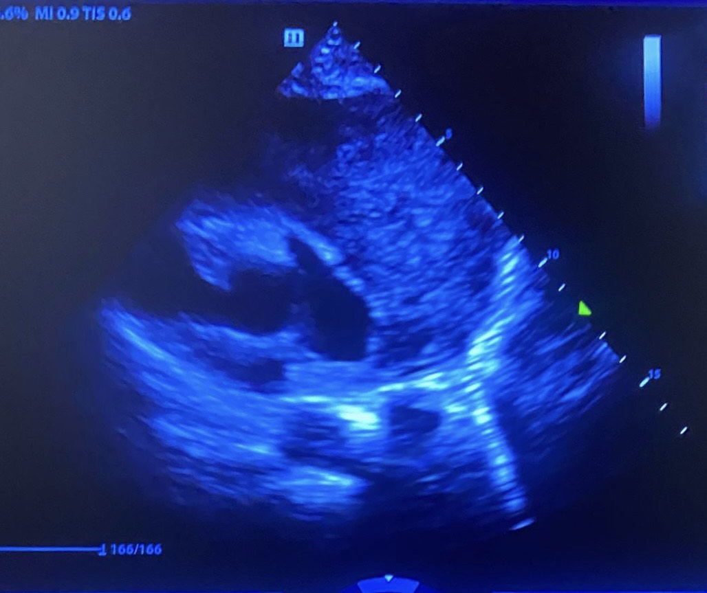 Ecocardiosopia: FEVI normal, ausencia de dilatación de cavidades derechas, sin datos de valvuloptía. Sin derrame pericárdico. En plano paraesternal eje corto masa homogénea e isoecogénica que rodea pericardio, con Doppler positivo.