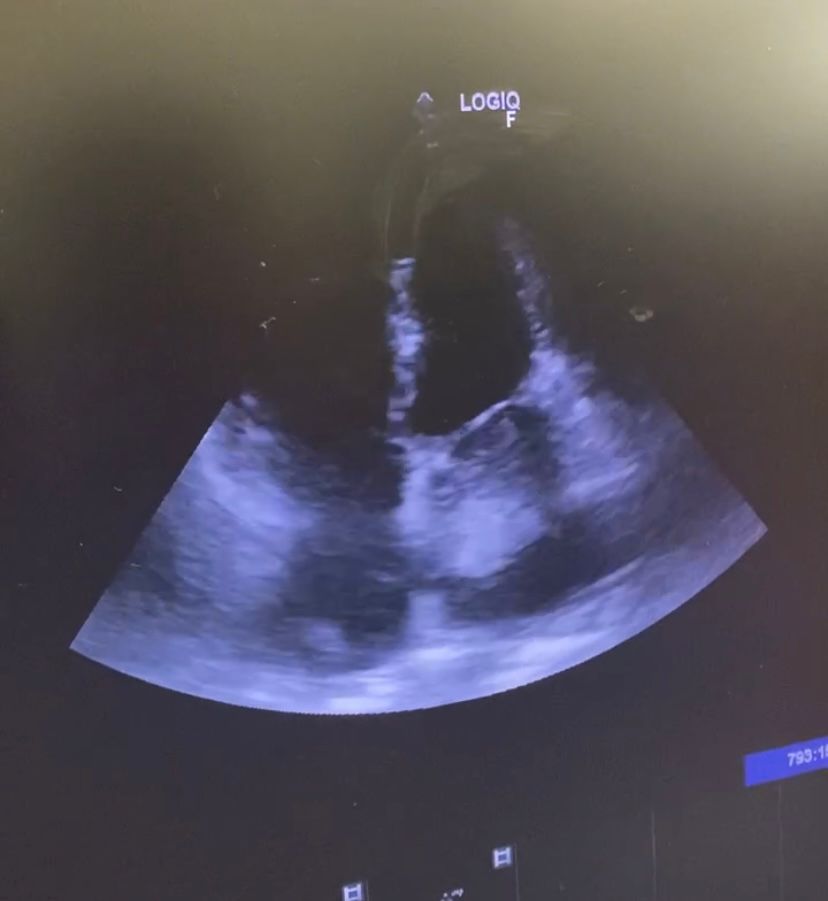 Se realiza ecografía trastorácica a pie de cama objetivándose gran masa a nivel de aurícula izquierda compatible con Mixoma auricular que protruye hacia válvula mitral generando obstrucción severa confirmándose en ecografía reglada posterior.