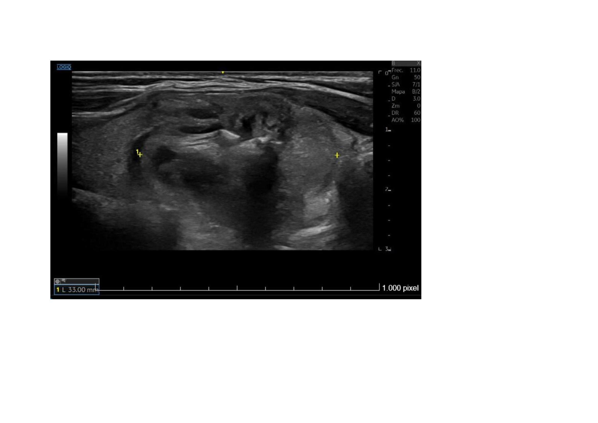 Ecografía Hospital: Lóbulo tiroideo derecho aumentado de tamaño (2,2 cm de diámetro anteroposteior), por la presencia de un nódulo sólido, heterogéneo, levemente hipoecoico, bien definido, con áreas de degeneración quística y calcificaciones groseras en su interior, de 22 x 21 x 33 mm. Resto del tiroides sin alteraciones. No se aprecian adenopatías cervicales. Glándulas salivares sin alteraciones. Conclusión: Nódulo en lóbulo tiroideo derecho, único, TIRADS 4.