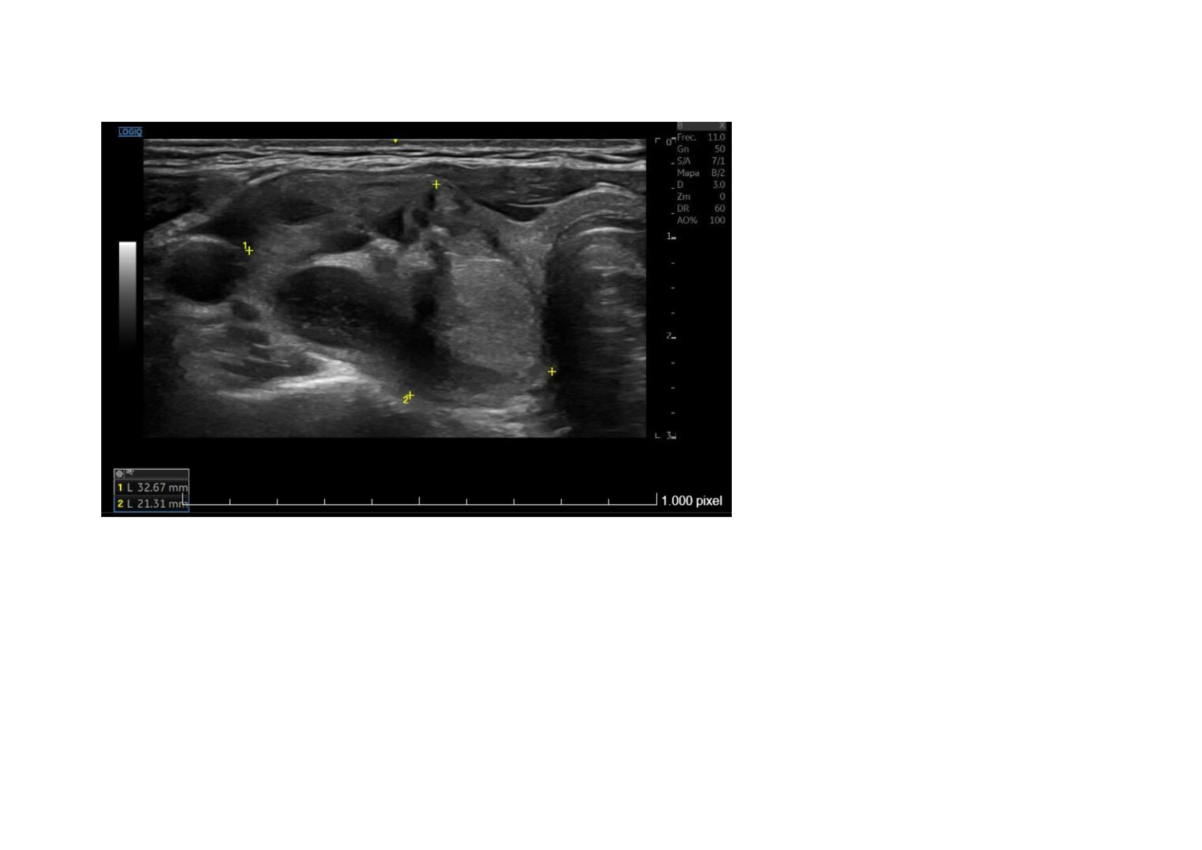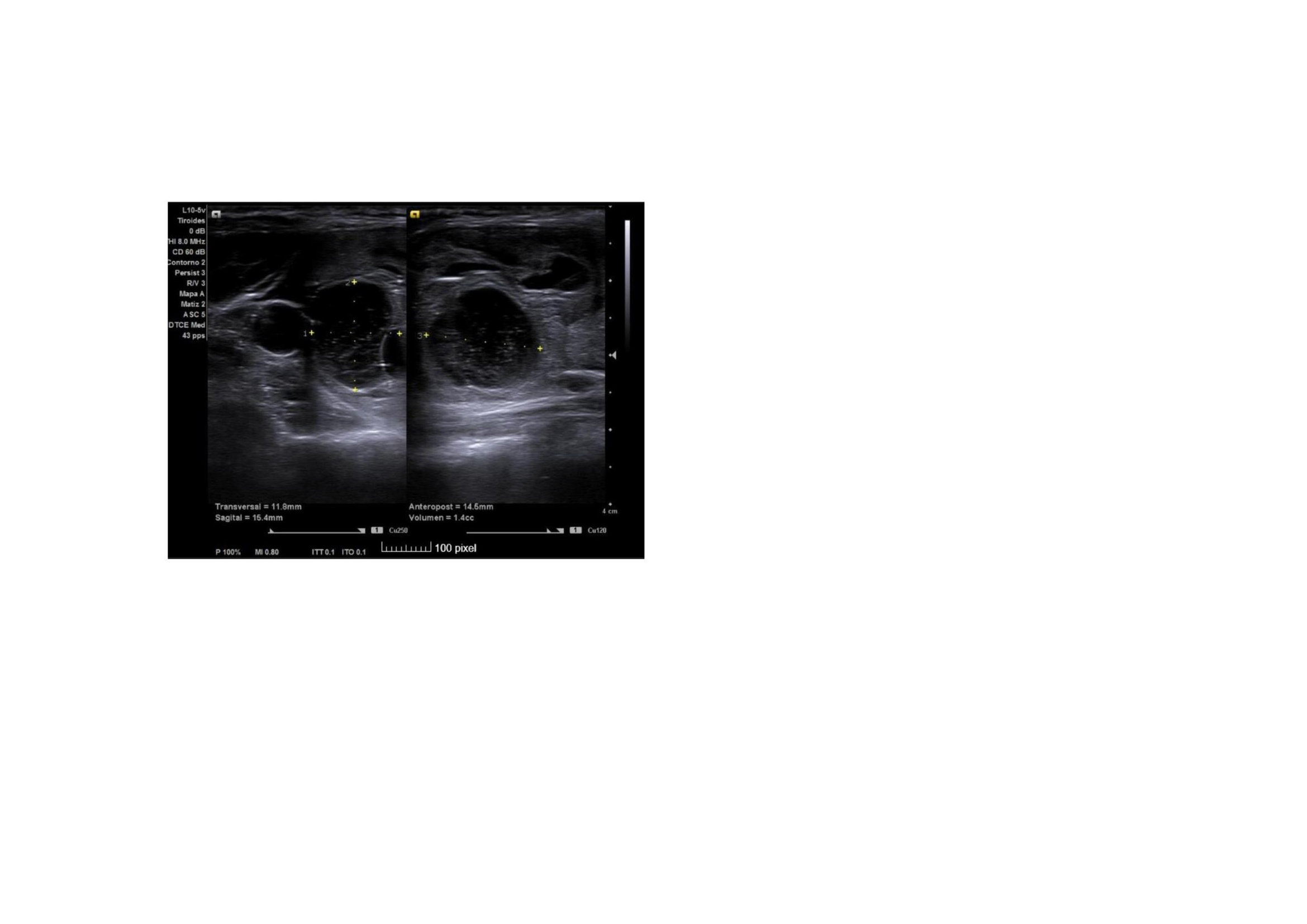 Ecografía clínica: En lóbulo tiroideo derecho observamos nódulo mixto sólido-quístico, de 11,8 x 14,5 x 15,4 mm, de bordes bien delimitados mayoritariamente hipoecogénico, parcialmente tabicado a nivel inferomedial, más alto que ancho con micro calcificaciones en su interior. TIRADS 5.