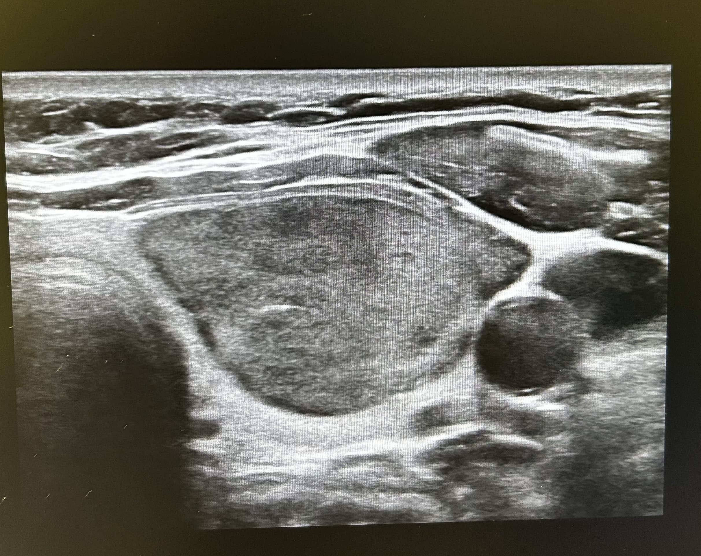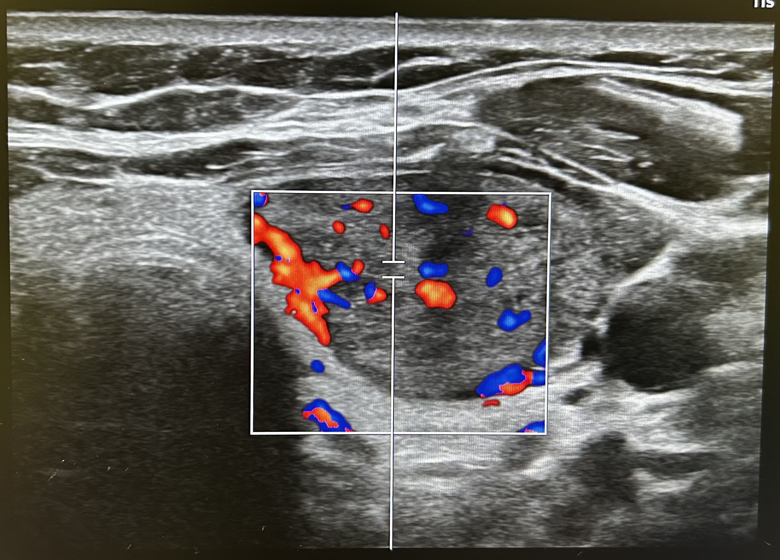 Apreciamos un nódulo tiroideo hipoecogénico y heterogéneo, de bordes irregulares y con vascularización central de 22 milímetros de diámetro mayor (transversal). Sin apreciar microcalcificaciones ni invasión de la glándula. No apreciamos adenopatías cervicales en rango patológico.
