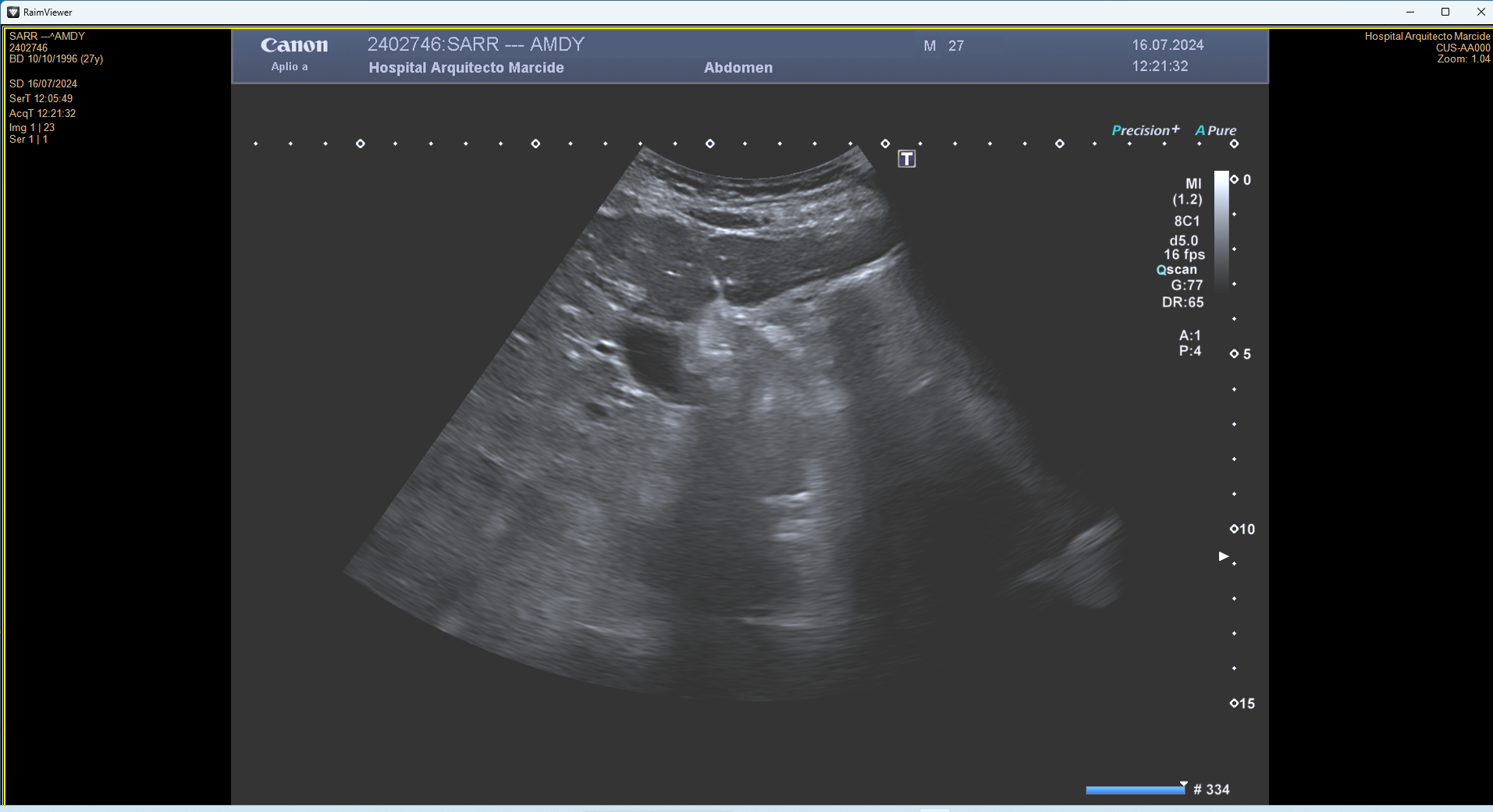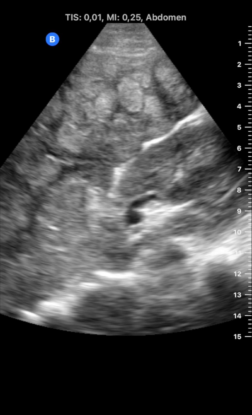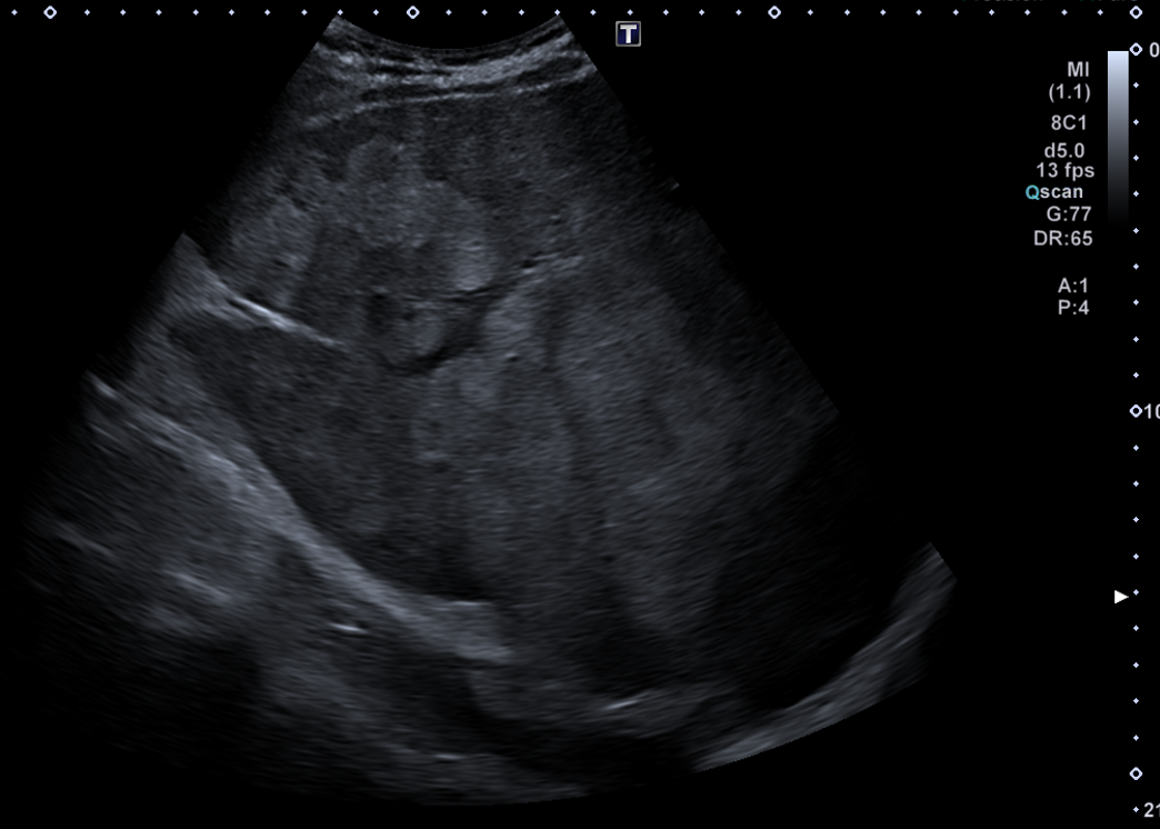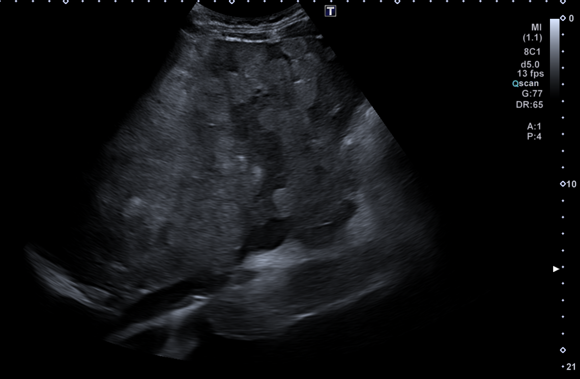 En ecografía en Centro de Salud: La práctica totalidad del parénquima hepático se encuentra sustituida por múltiples lesiones sólidas nodulares hiperecoicas, de predominio en el lóbulo hepático derecho, donde presentan tendencia a la confluencia y conforman una masa que alcanza los 13 cm de diámetro máximo. La vena porta es permeable y ectásica, con esplenomegalia. Ambos son signos de hipertensión portal.