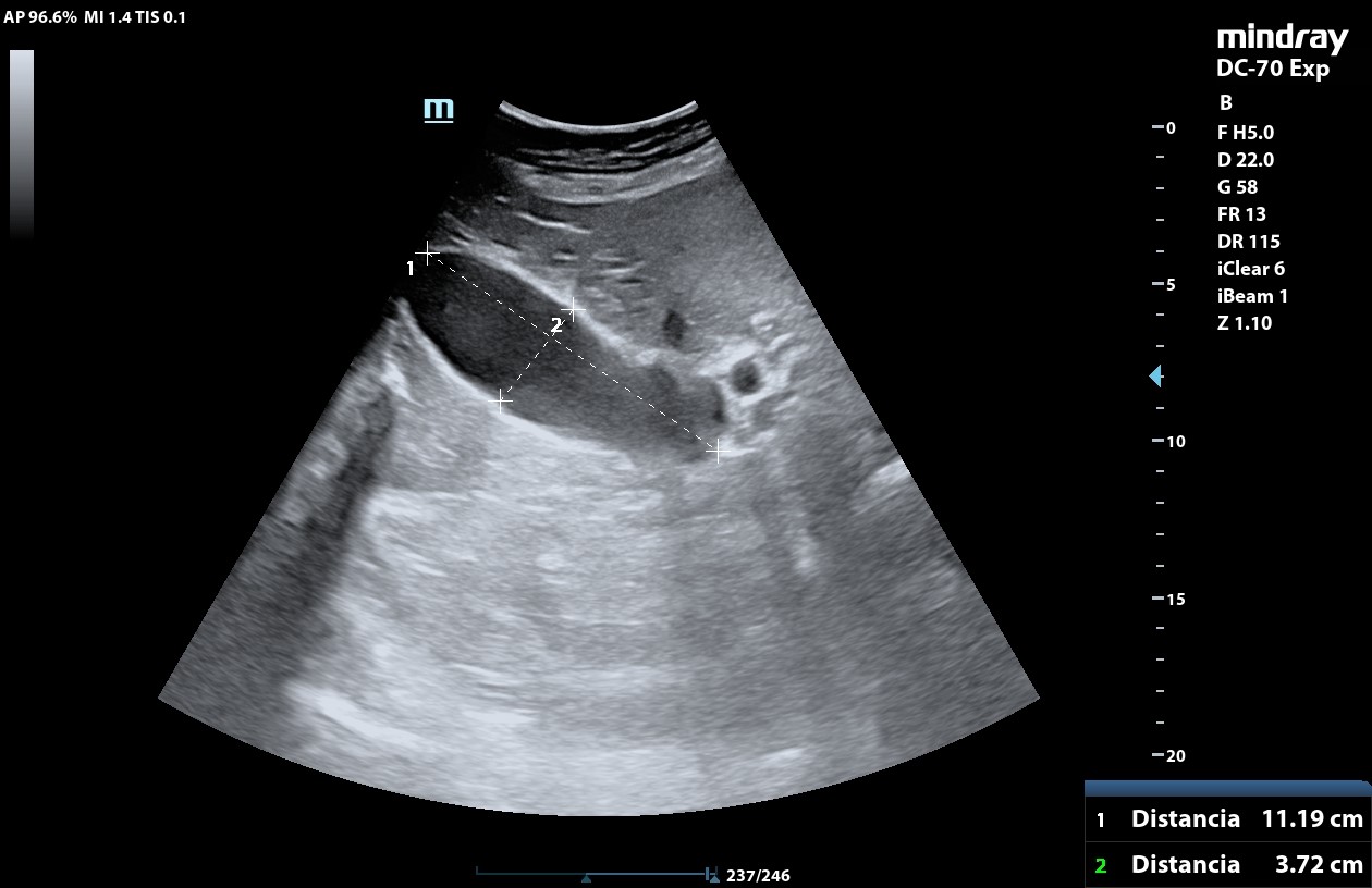 - POCUS: aumento tamaño de la vesícula biliar, eje longitudinal mayor de 11,19 cm, con pared vesicular engrosada de 0,43 cm y dilatación de la vía biliar. En su interior hay material ecogénico que no deja sombra posterior, compatible con barro biliar. No objetivo páncreas por interposición de gas intestinal. No presencia de líquido libre.