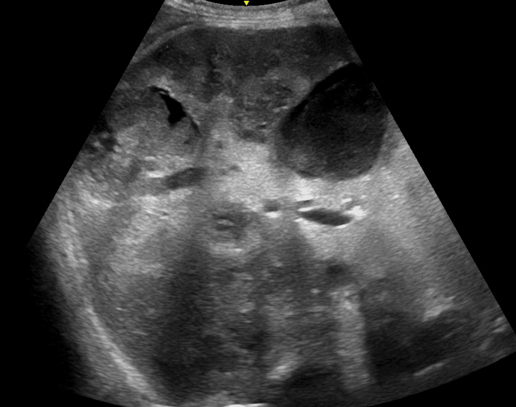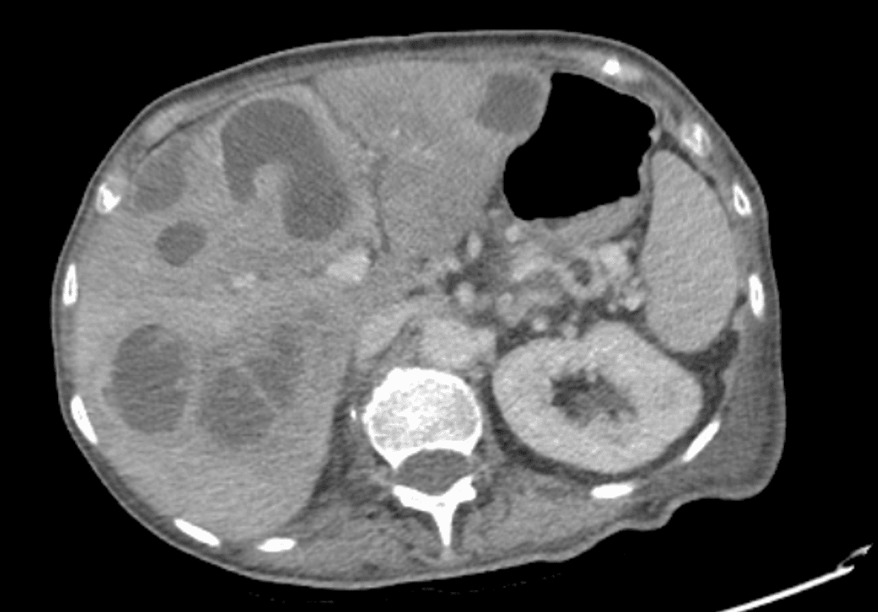 Se realiza una ecografía abdominal a pie de cama con hallazgo de múltiples imágenes hipodensas con contenido heterogéneo y áreas quísticas en hígado, sugestivas de metástasis, por lo que se solicita TAC abdominopélvico que confirma dichas lesiones con componente necrótico sobreinfectado y una con extensa neoplasia rectal localmente avanzada.