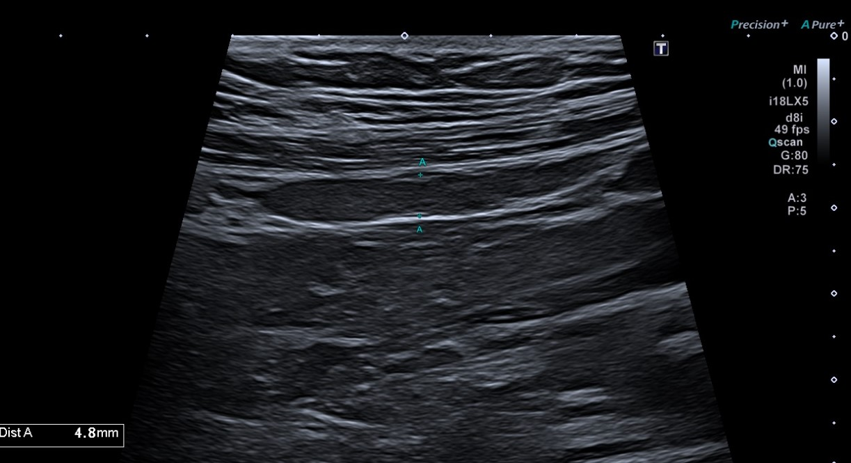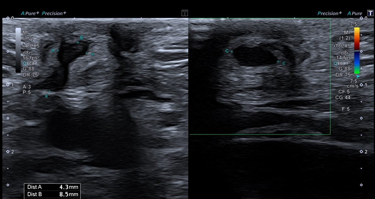 Ecografía partes blandas: En localización infraumbilical, sin aparente dependencia de estructuras profundas ni modificación en maniobra de Valsalva, lesión hipoecoica bilobulada (4,3 x 8,5 x 7,1 mm) con aparente conexión hacia región vesical, sobre la que no se demuestra vascularización, inespecífica, que podría corresponder a seno uracal, sin poder descartar sobreinfección asociada.