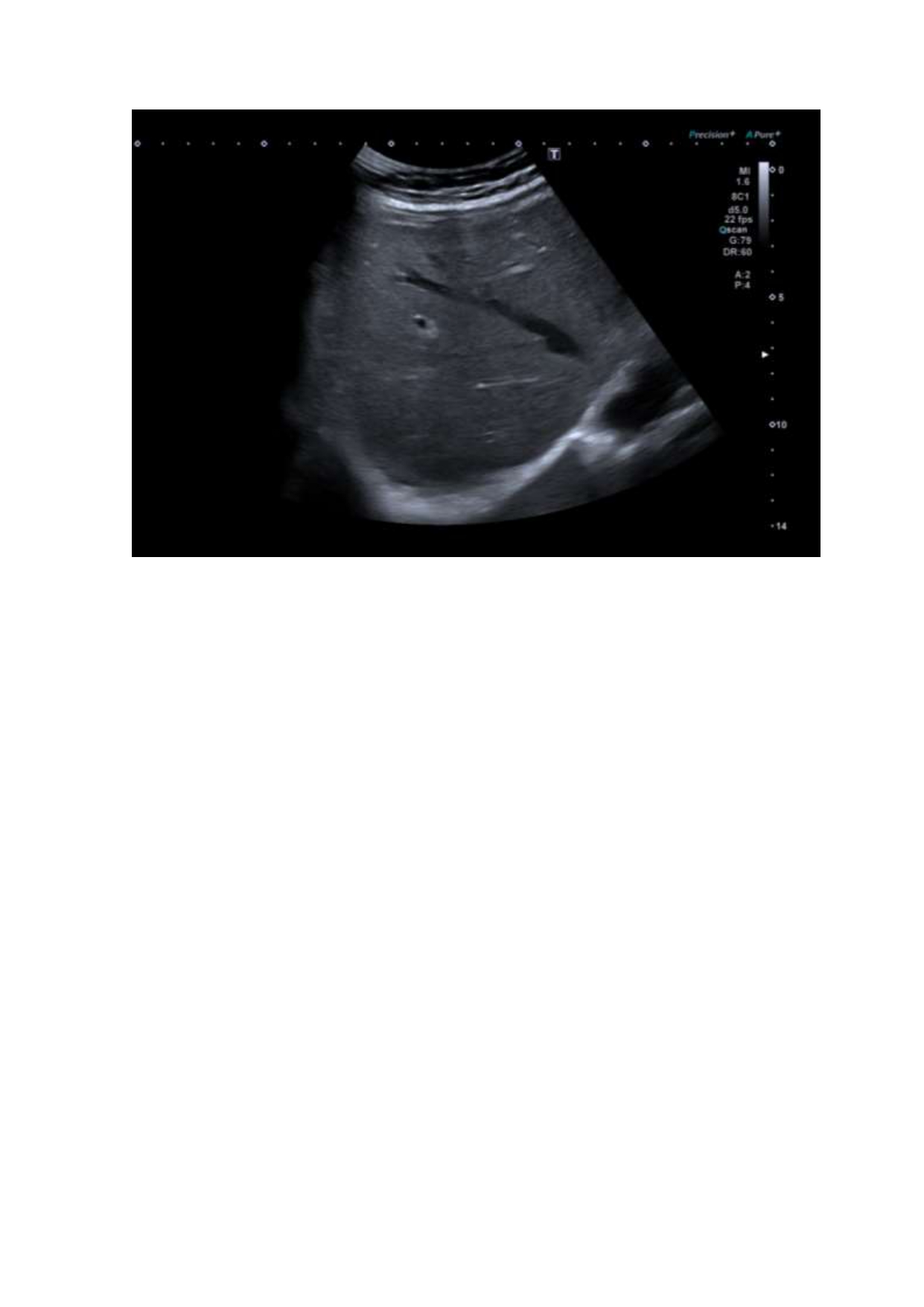 Exploración, ictericia conjuntival, febrícula 37,3 °C. A la palpación abdominal presentaba hepatomegalia dolorosa (3 cm por debajo del borde costal) y dolor en hipocondrio derecho.