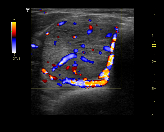 Se estudia la glándula tiroidea mediante sonda lineal de alta frecuencia, realizando cortes transversales y longitudinales. A nivel del lóbulo tiroideo derecho se objetiva un nódulo sólido, con forma «más ancho que alto», isoecoico, con zonas heteroecoicas de 2,4 x 3,4 cm (figura 1), que presenta una lobulación en su margen interno (figura 2), con halo periférico incompleto y vascularización mixta, principalmente periférica (figura 3). No se observan calcificaciones ni adenopatías patológicas. Adyacente al mismo, otro nódulo milimétrico (figura 4), de similares características.