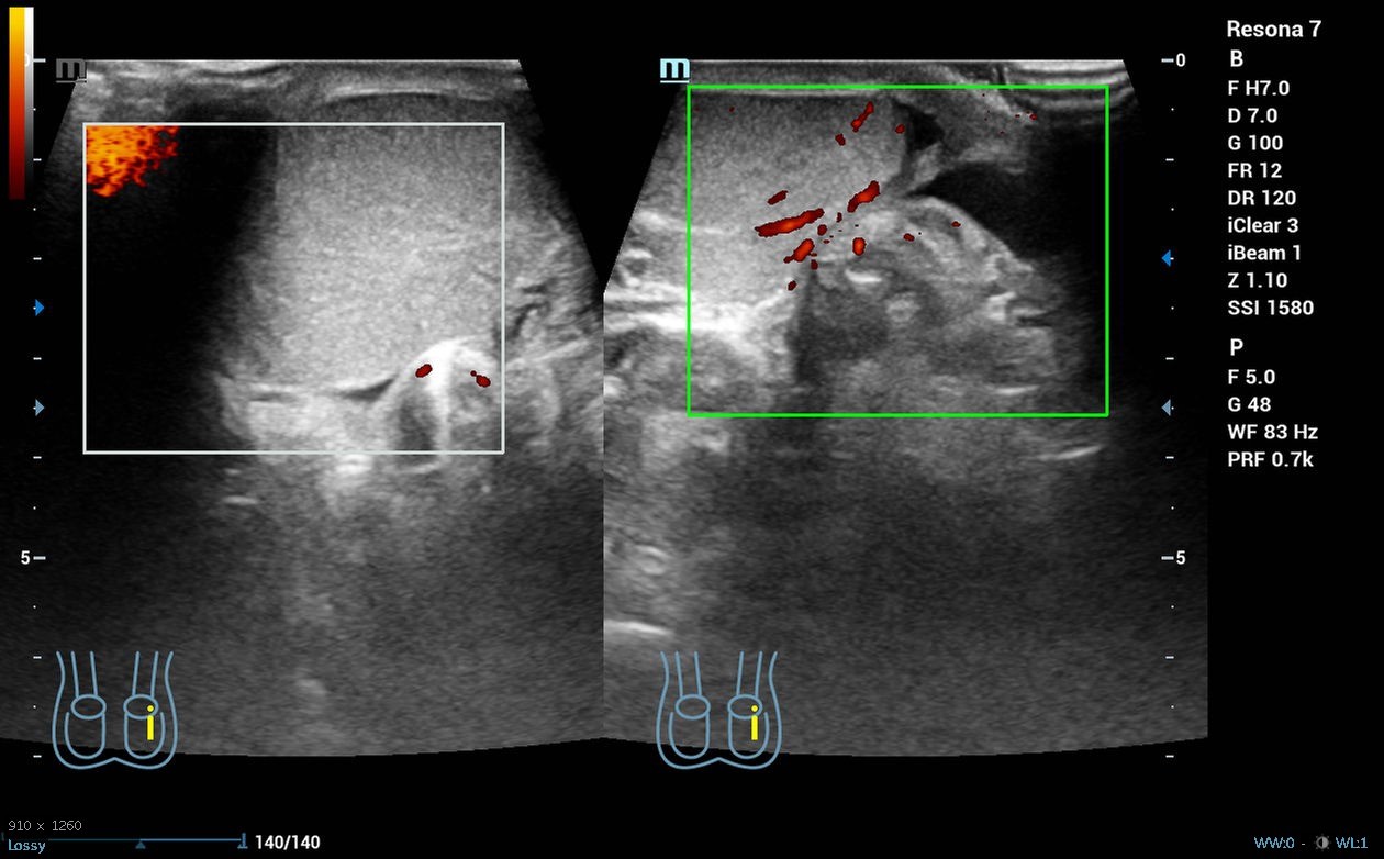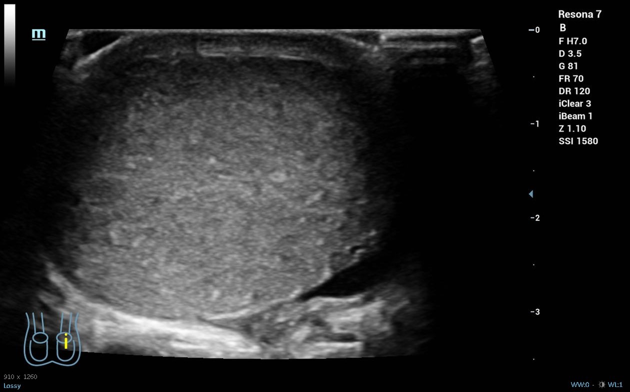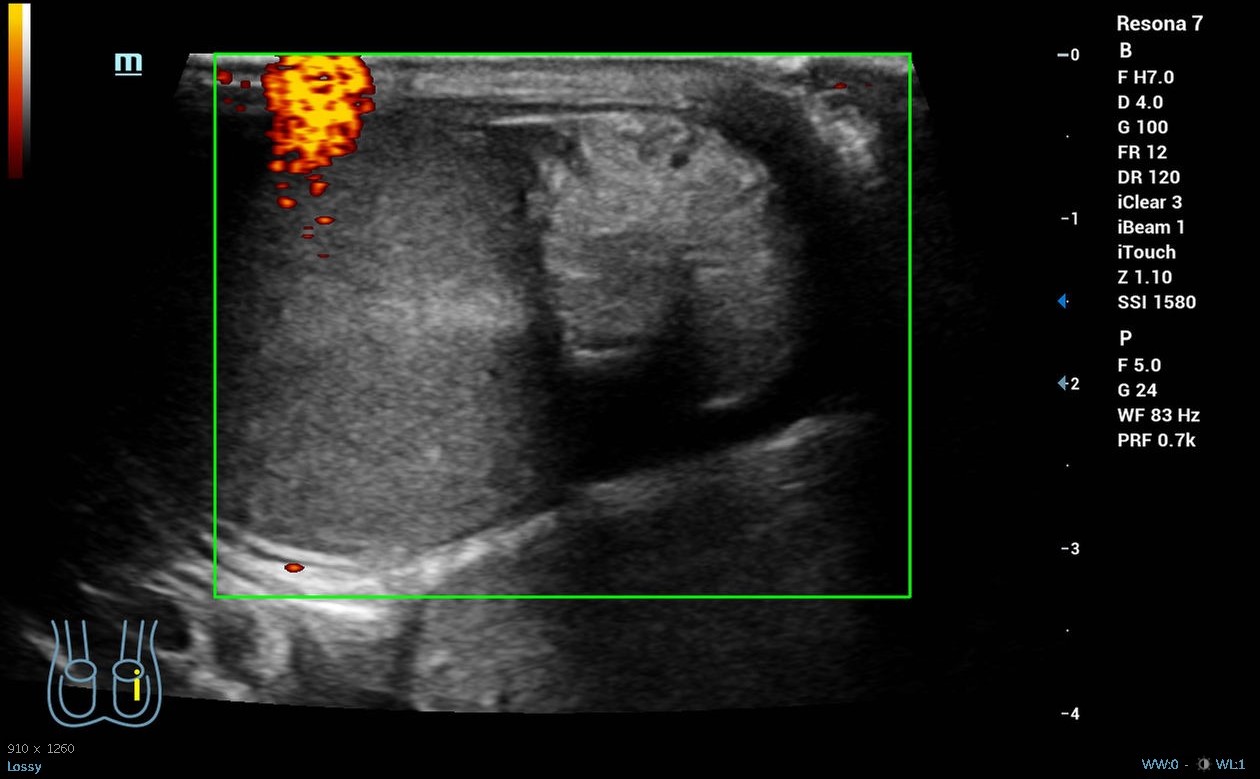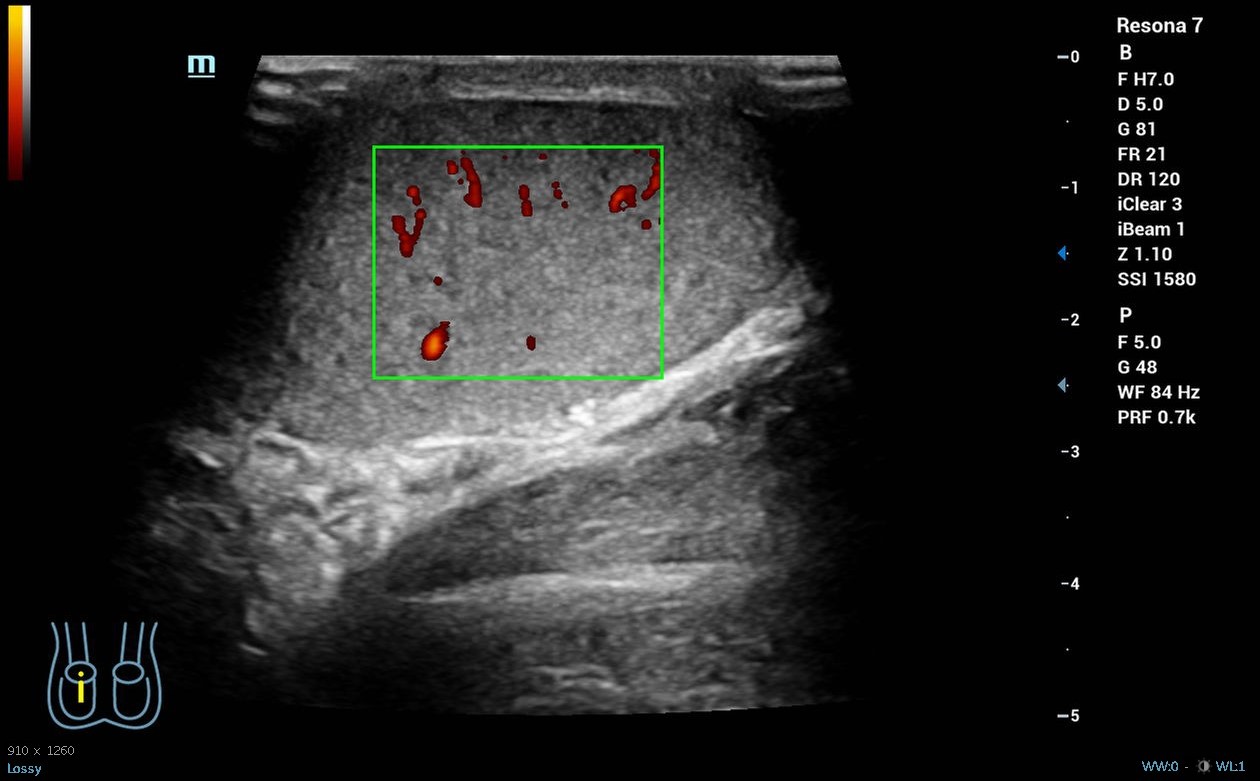 Hombre de 19 años sin antecedentes de interés que acude a la guardia del centro de salud por dolor súbito en el testículo derecho desde las 04.00 h que le ha despertado, asociado a náuseas y vómitos, sin otra clínica infecciosa o traumática acompañante. A la exploración física presenta abdomen normal, pero teste izquierdo ascendido y horizontalizado, doloroso a la palpación, con discreto aumento de tamaño o cambios en temperatura, con signo de Prehn negativo y reflejo cremastérico ausente en lado izquierdo. Se realiza ecografía clínica, donde se objetiva testículo izquierdo aumentado de tamaño con morfología y ecoestructura normal, pero con ausencia de flujo power-Doppler en su interior, ligero hidrocele y aparente giro del cordón espermático en su porción distal.